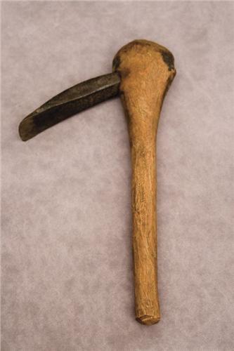 Northwest Coast Adze. 14" with an 8 ½” blade. Carved wood with an inset forged iron blade showing great patina. Used to carve totem poles and canoes. 19th century. (est $900-1,200).