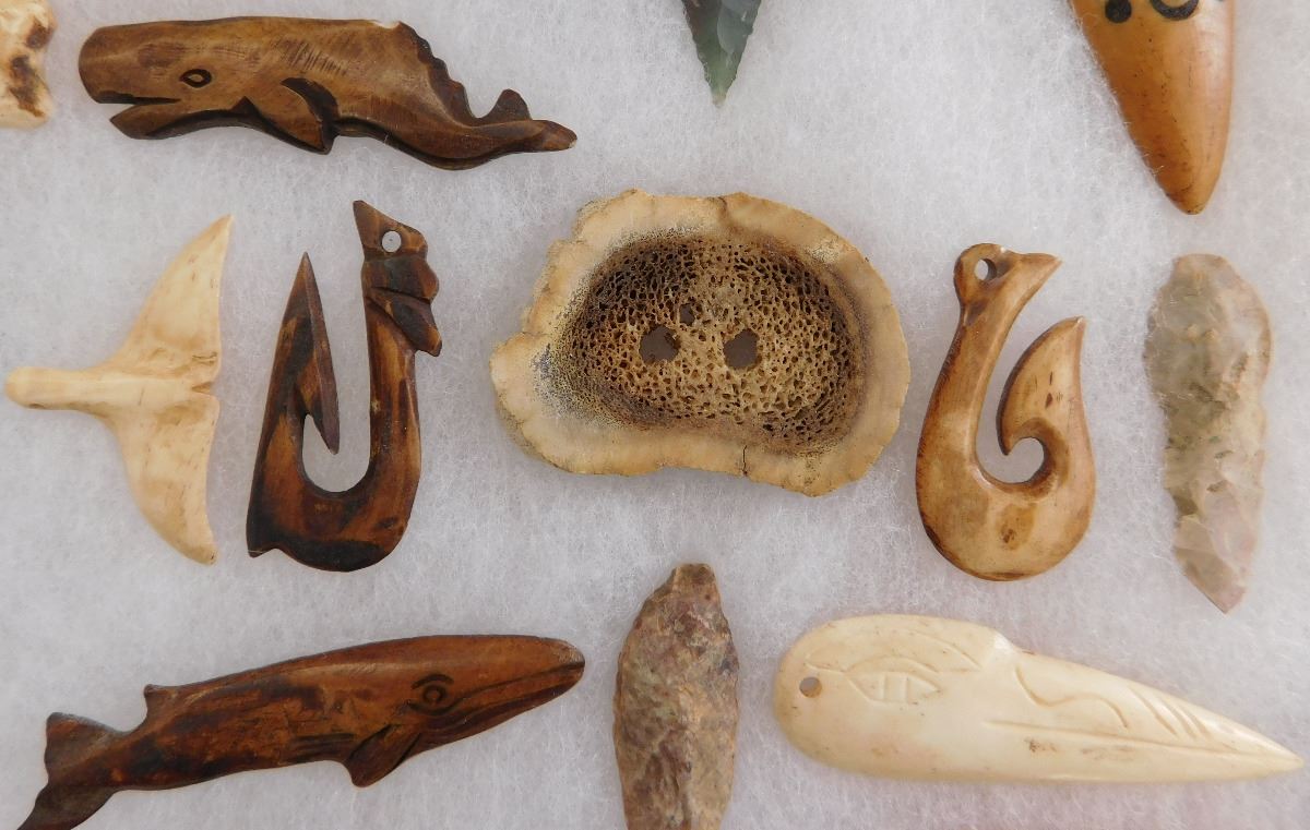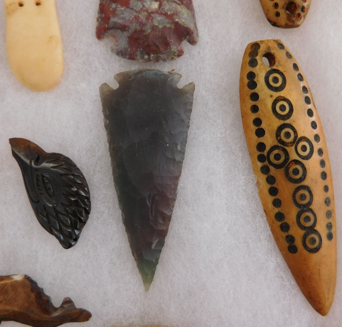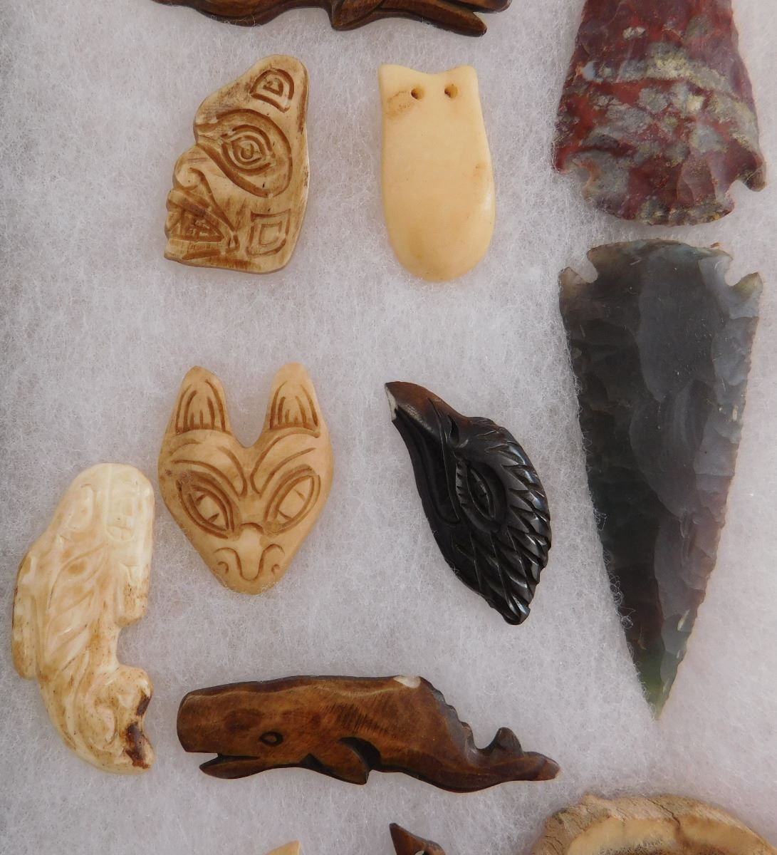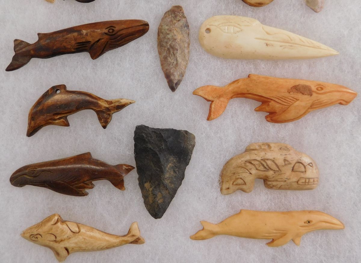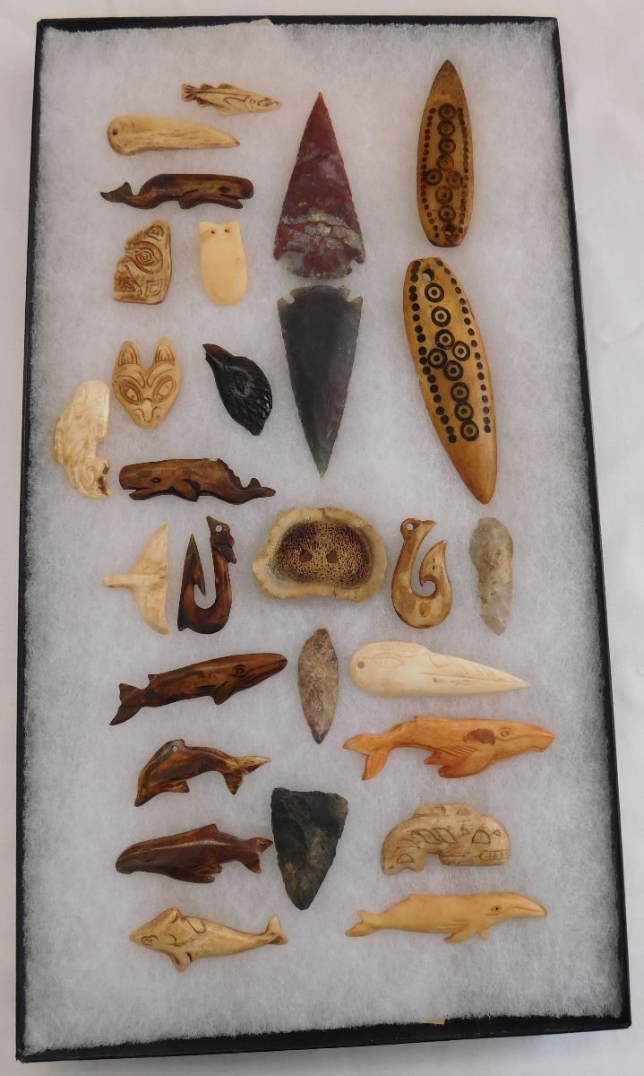 Very nice collection of Alaskan and Canadian NWC artifacts made from agate, antler, bone and flint. Items appear to be in good condition. See pictures. Frame is not included. Shipping: $18. These items came from long time collector in the San Diego area.
