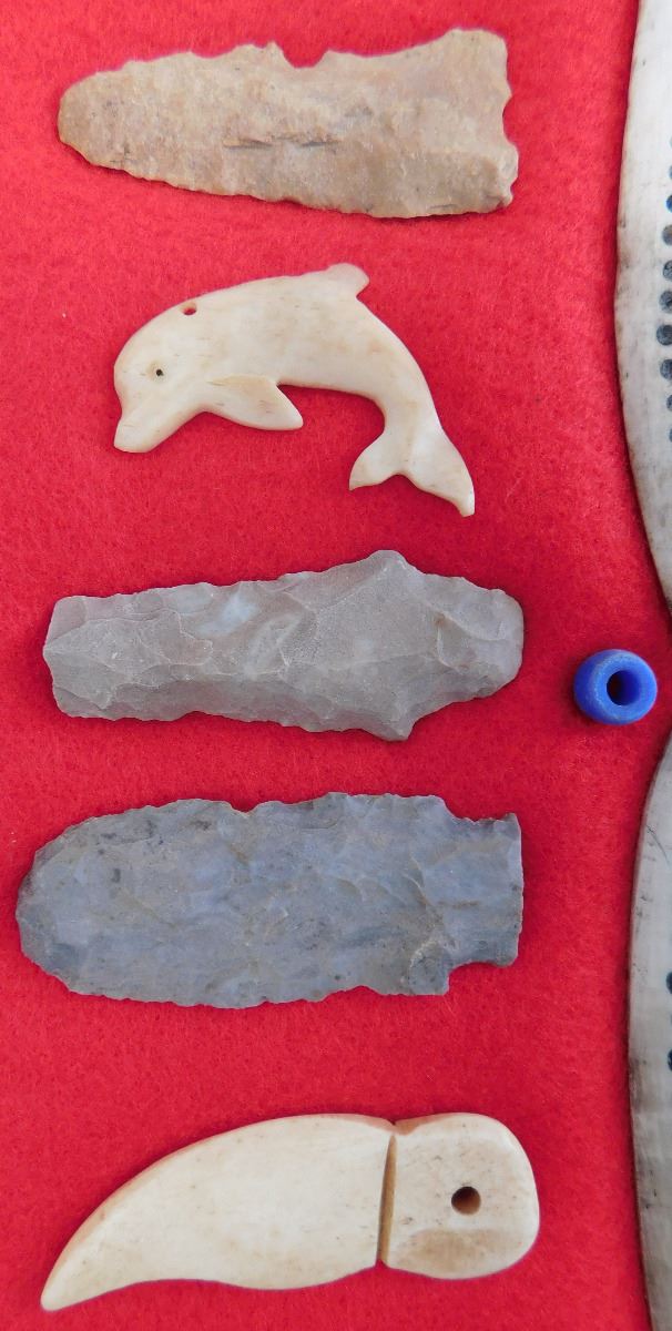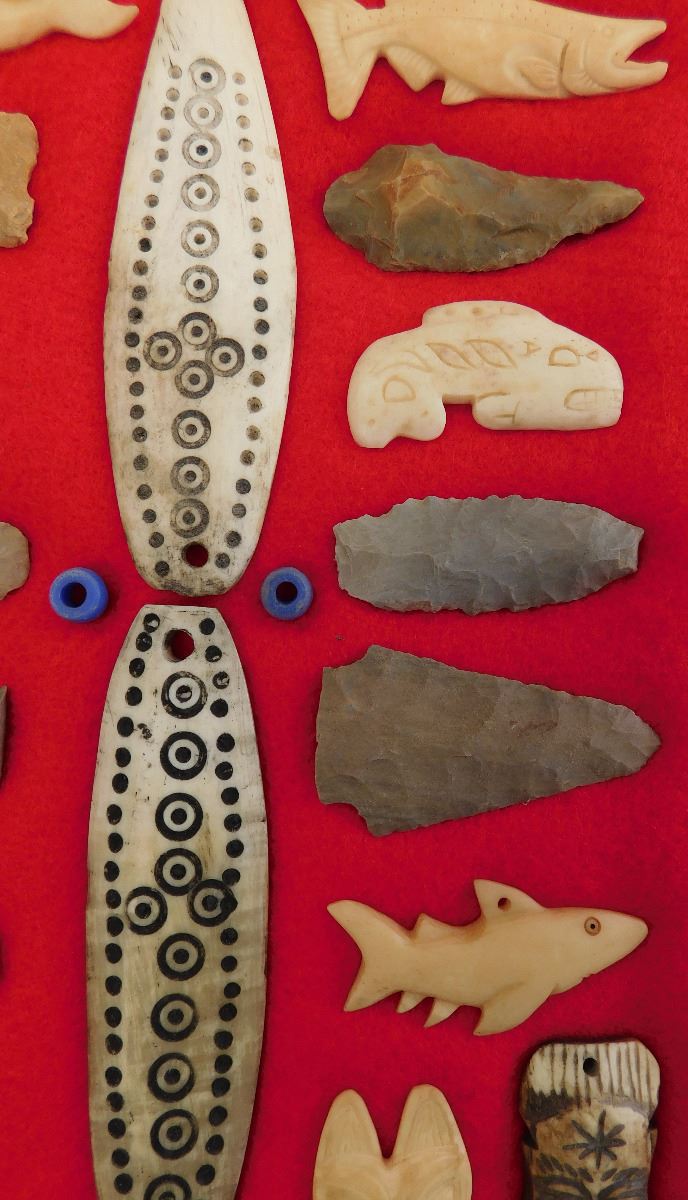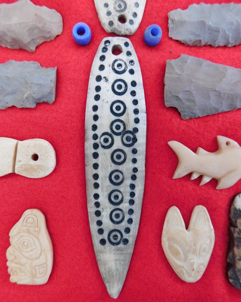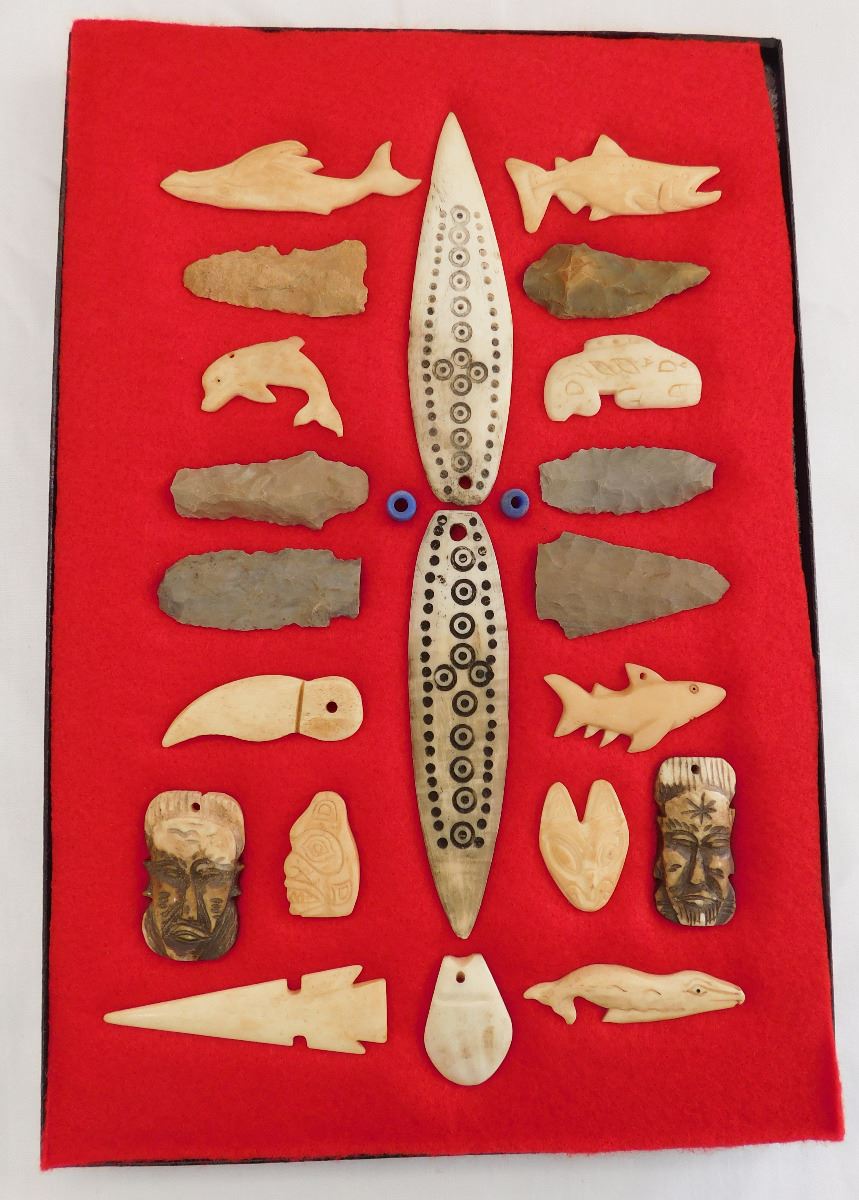 This item is a Northwest Coast Artifact Display consisting of flint, bone, glass beads. Items measures 1 to 4 1/2 inches and are from Canada and Alaska. Some of the points are damaged. This is a nice collection of effigies, carving and points. Frame is not included. Shipping: $18.00. These items came from long time collector in the San Diego area.