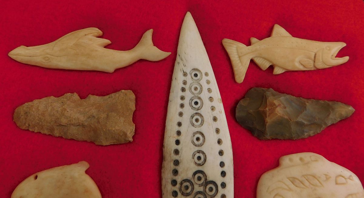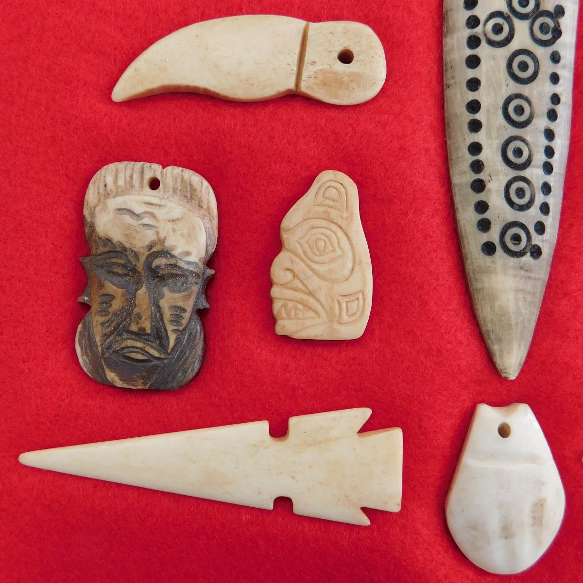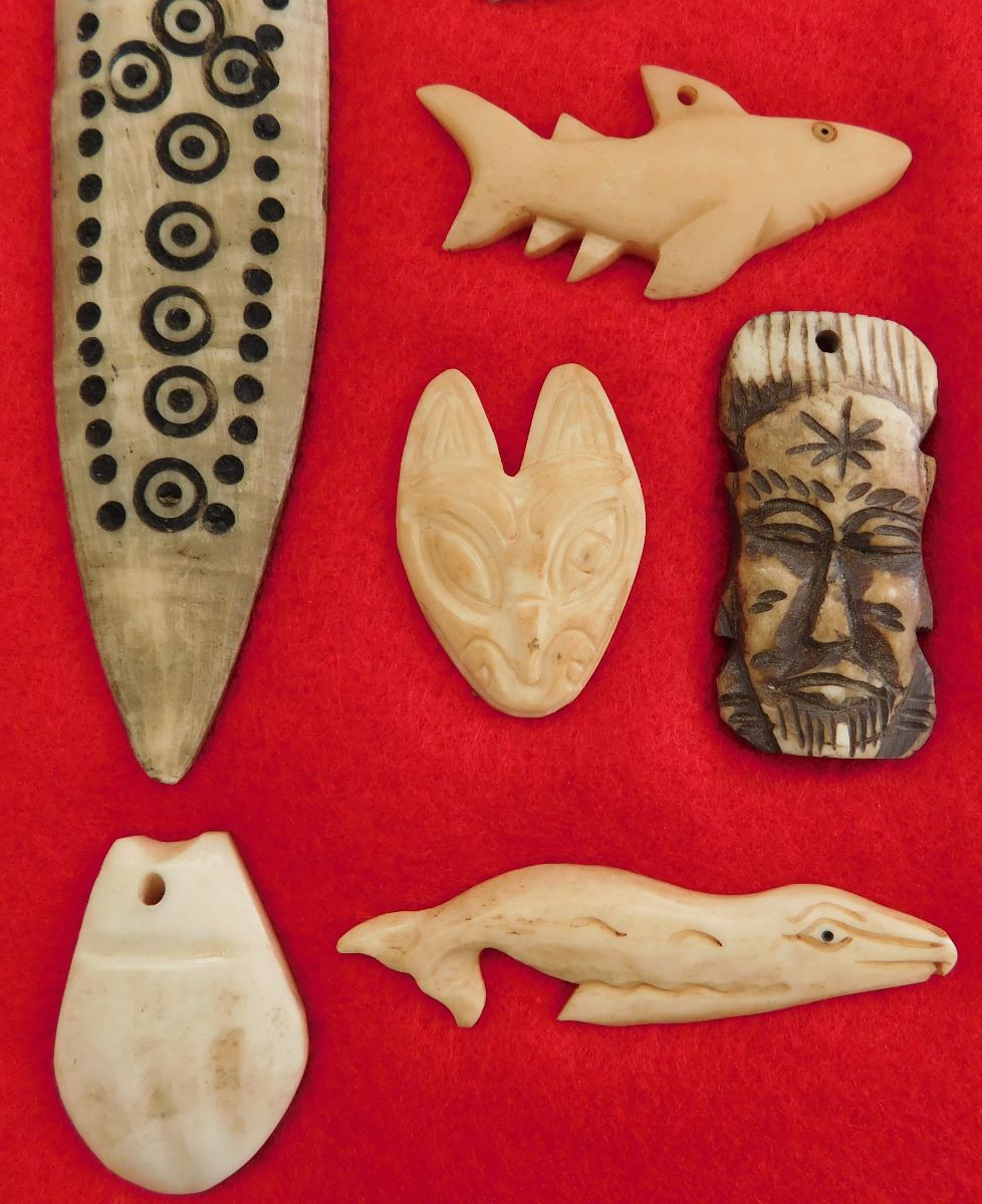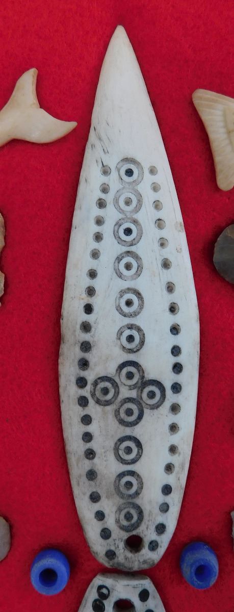 This item is a Northwest Coast Artifact Display consisting of flint, bone, glass beads. Items measures 1 to 4 1/2 inches and are from Canada and Alaska. Some of the points are damaged. This is a nice collection of effigies, carving and points. Frame is not included. Shipping: $18.00. These items came from long time collector in the San Diego area.