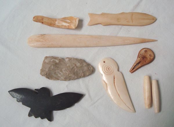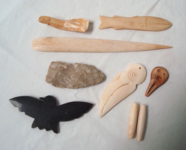 Northwest Coast Artifacts, longest measures 6.25''L x .5'' (bone awl), #1 Bone Awl #2 Hare Bone Beads #3 Jet Blackbird Fetish #4 Bone Awl Fish Pendant #5 Ivory Eagle Head Pendant #6 Ivory Tooth #7 Arrowhead