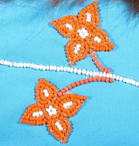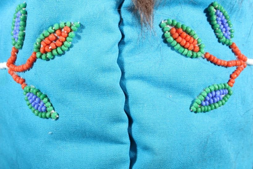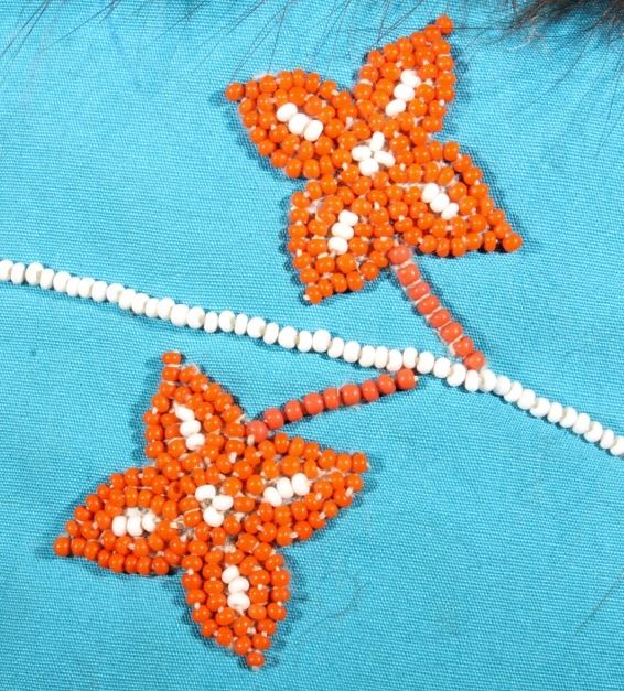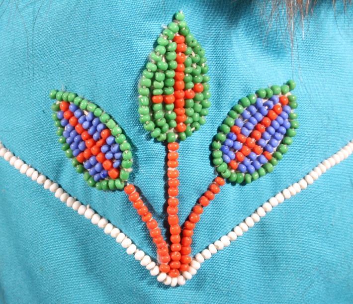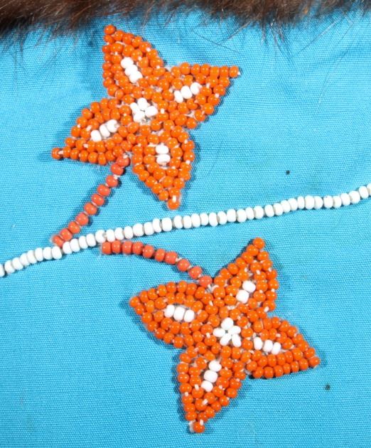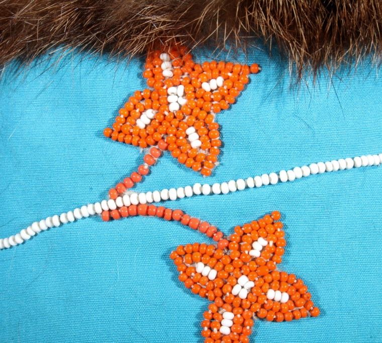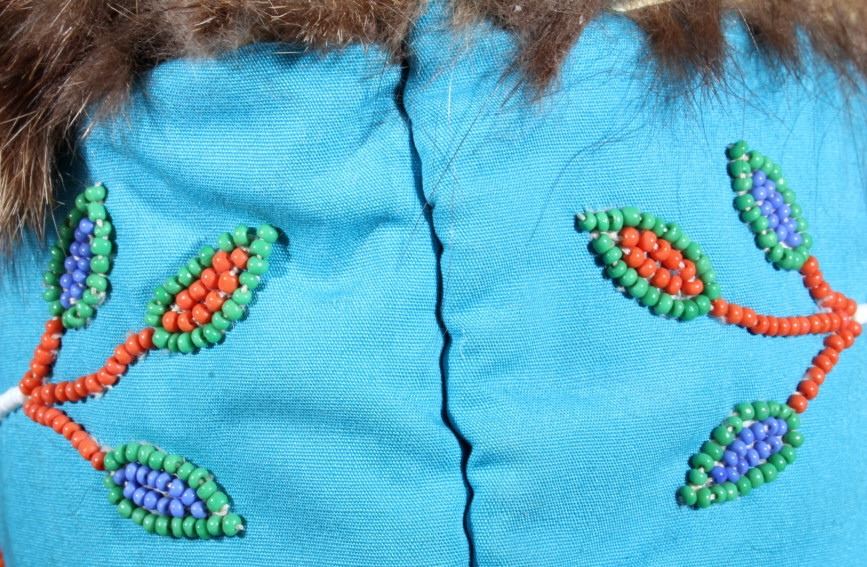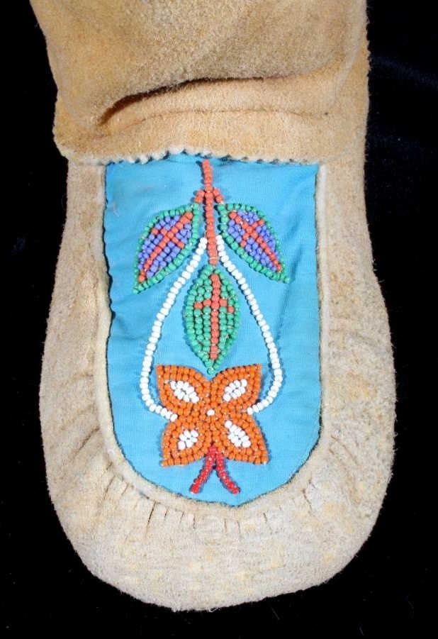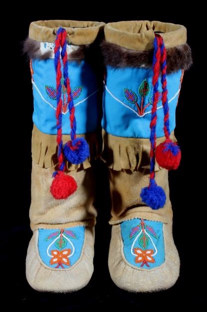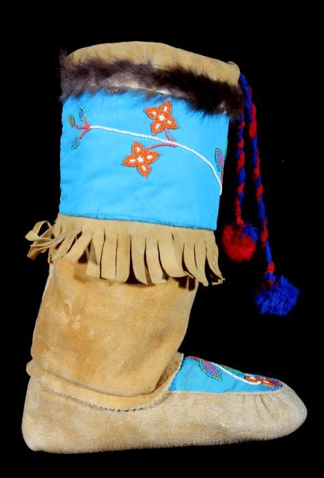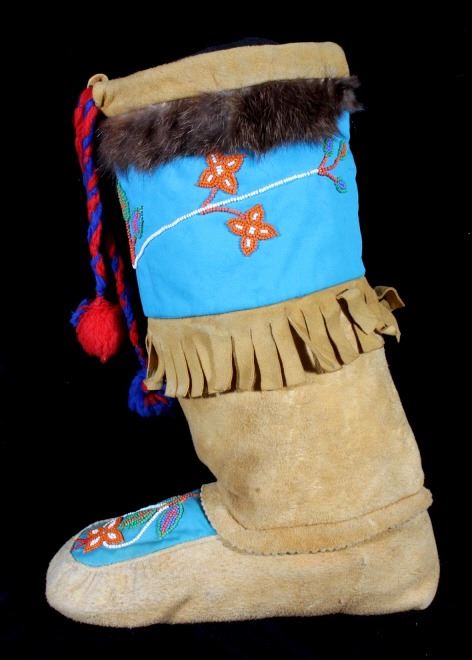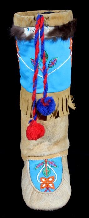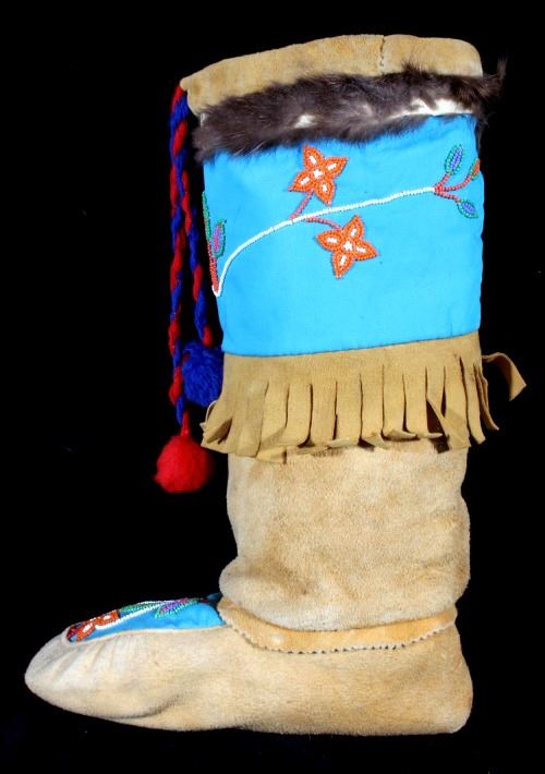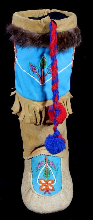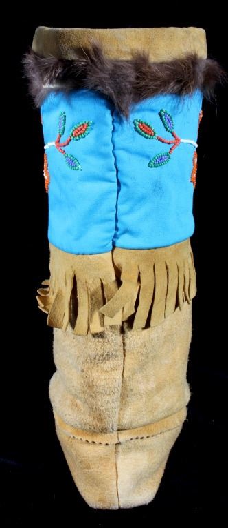 This is a wonderful set of vintage mid-century beaded high top moccasin boots from the Northwest Coast Native American Indians. These mid-1900's moccasins show a Mukluk style of craftsmanship with Indian tanned Reindeer (Caribou) hide with a soft boot having a decorated top with pinched or rolled in foot end with high boot like ankle/leg covering. The set shows a light blue calico trade clothe decoration with period correct glass trade seed beads in a floral design. The top of the moccasins show an approximately one inch accent piece of beaver fur with two braided blue and red yarn ties. The entire top also shows a wonderful beaded floral design. These overall show a good condition with some loss to the beaver fur as shown, but overall in very good displaying and wearing condition. Measures overall 10.5" long sole, 15" high ankle, and approximately 4 to 4.5"W. At the middle of the ankle or leg covering shows an added fringe made with commercially made leather, possibly a much newer addition.
