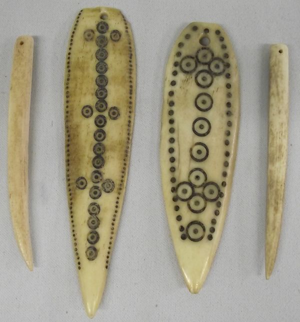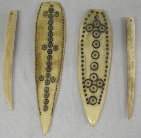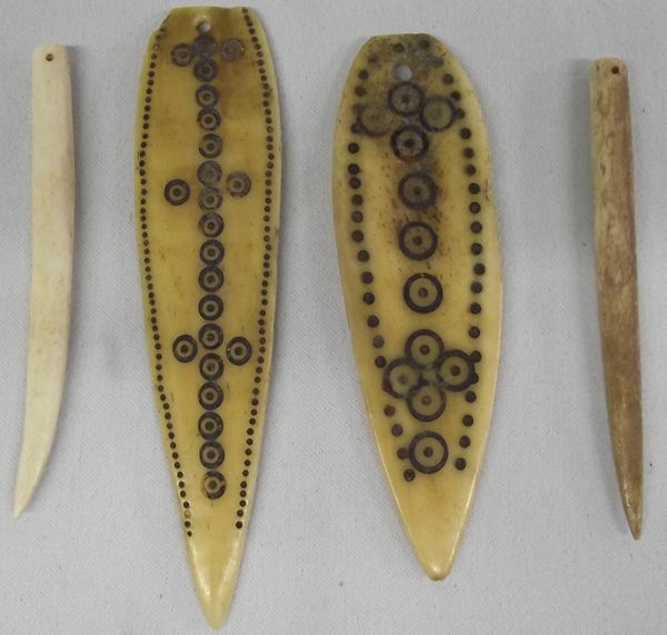 Northwest Coast Bone Awls. Four pieces, two of which are highly decorated. Nice collection of Northwest artifacts.