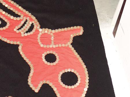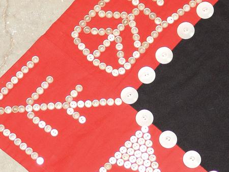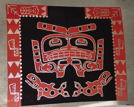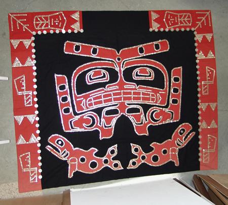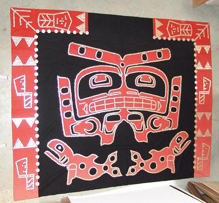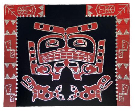 Circa Mid 1900s, Beautiful hand crafted black tradecloth robe trimmed with red cotton and adorned with thousands of shell buttons with many different traditional Haida/Northwest Coast symbols. Very good condition. 58" x 70"