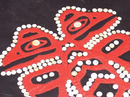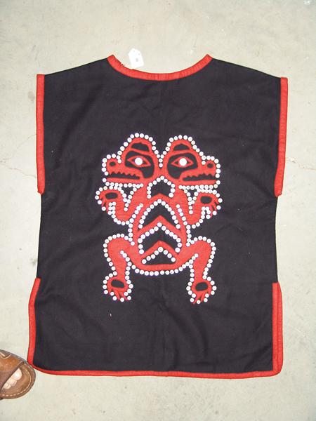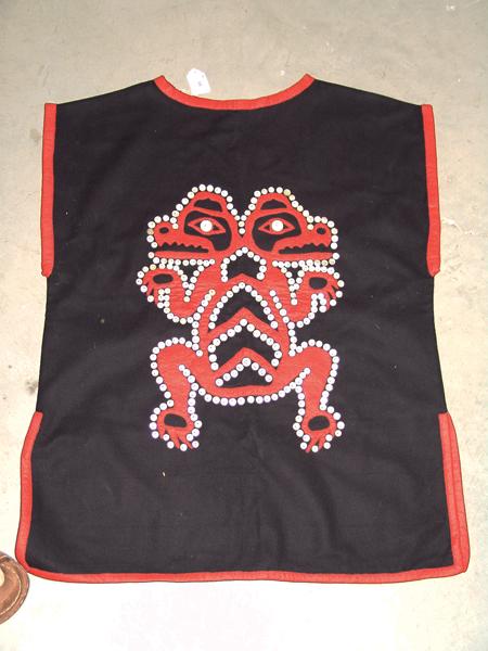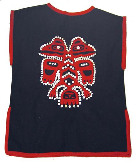 Circa Late 1900s, Beautiful hand crafted "button blanket" style tunic with bear and eagle figures front and back, constructed of indigo trade cloth and red felt. Excellent condition. 31" x 25" From the Johnson Collection.