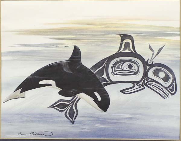 Northwest Coast Canadian Print by Sue Coleman, visual measures 10.5'' x 13.5'' and is signed by the artist, FYI: ''Sue Coleman has earned international recognition for her distinctive watercolor paintings & prints. Especially popular have been her 'Interpretive' Northwest Coast First Nations images.''