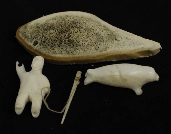 Native American Northwest Coast Carved Bone Seal Hunter Figure, measures 1.75''H x 1.25''W x 3''