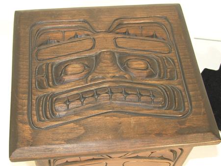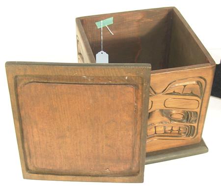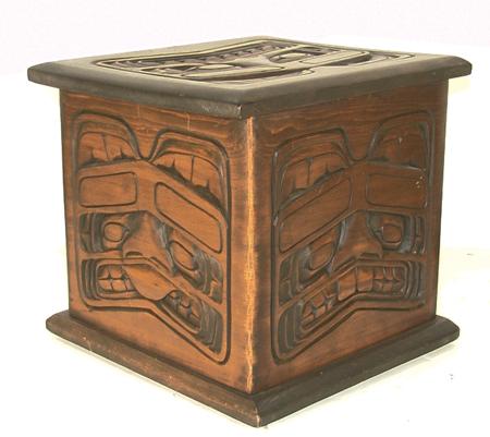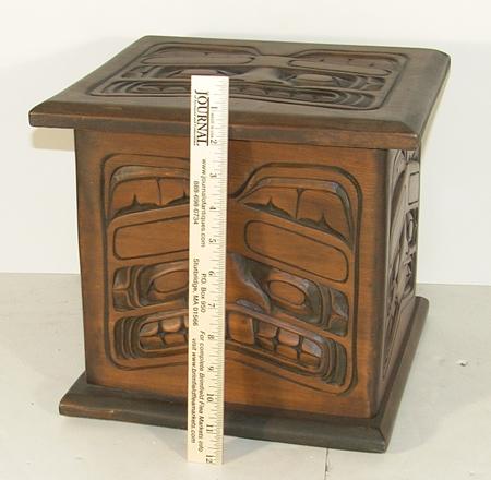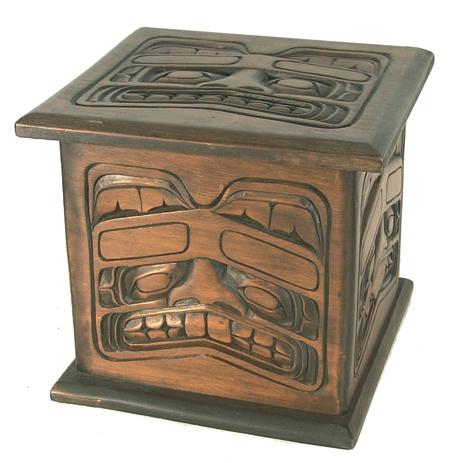 Vintage hand carved lidded cedar box with a traditional bear face on all 4 sides and top. Condition: very good, signed. 11" x 12" x 12"