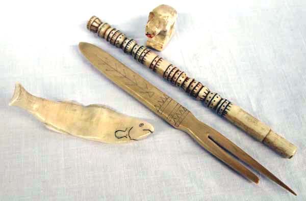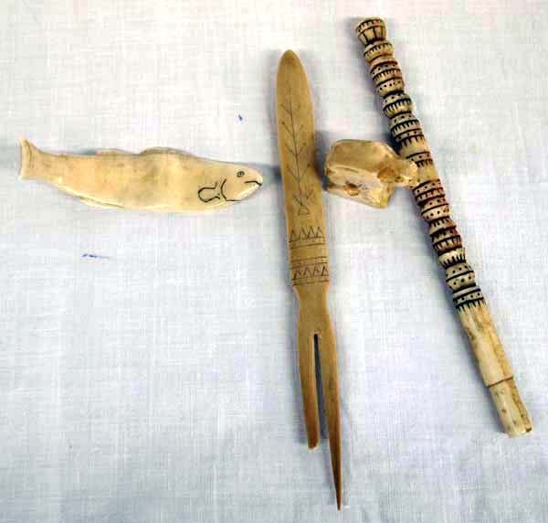 Northwest Coast Carved Ivory Tools and Fetishes, largest measures 5''L, includes salmon and polar bear fetish, the fork/pick has a broken tine, beautifully carved, intricate details on two of the pieces