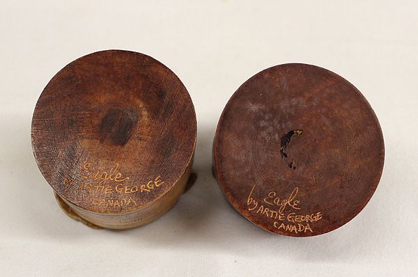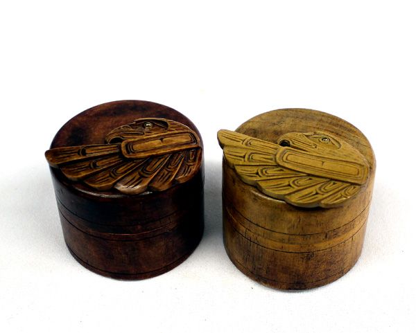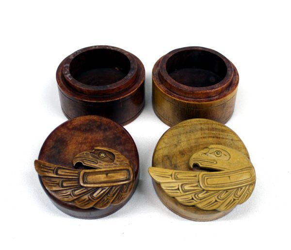 Northwest Coast Carved Wood Boxes by Artie George, both features Northwest Coast designed eagles on both tops, one is dark and the other is light wood, both measure 2.25in. H x 2.5in. W, both are signed on bottom Eagle by Artie George Canada and eagles each have glass eye