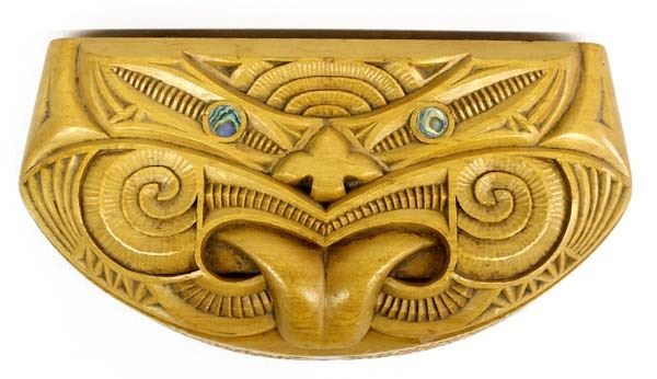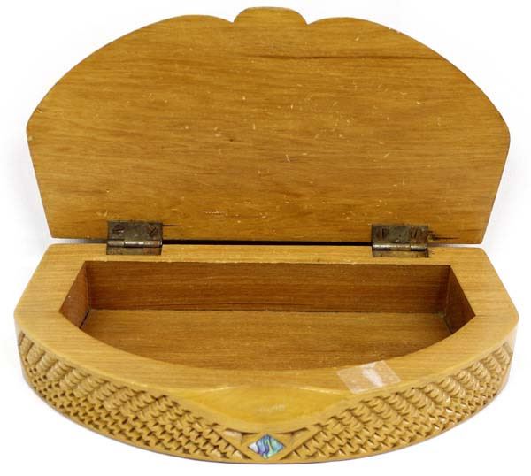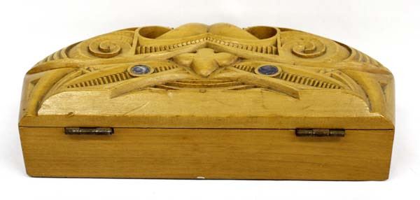 Northwest Coast Designed Carved Wood Box, hinged lid, inlay abalone embellishments, measures 10.75''L x 2.25''H x 5.5''W
