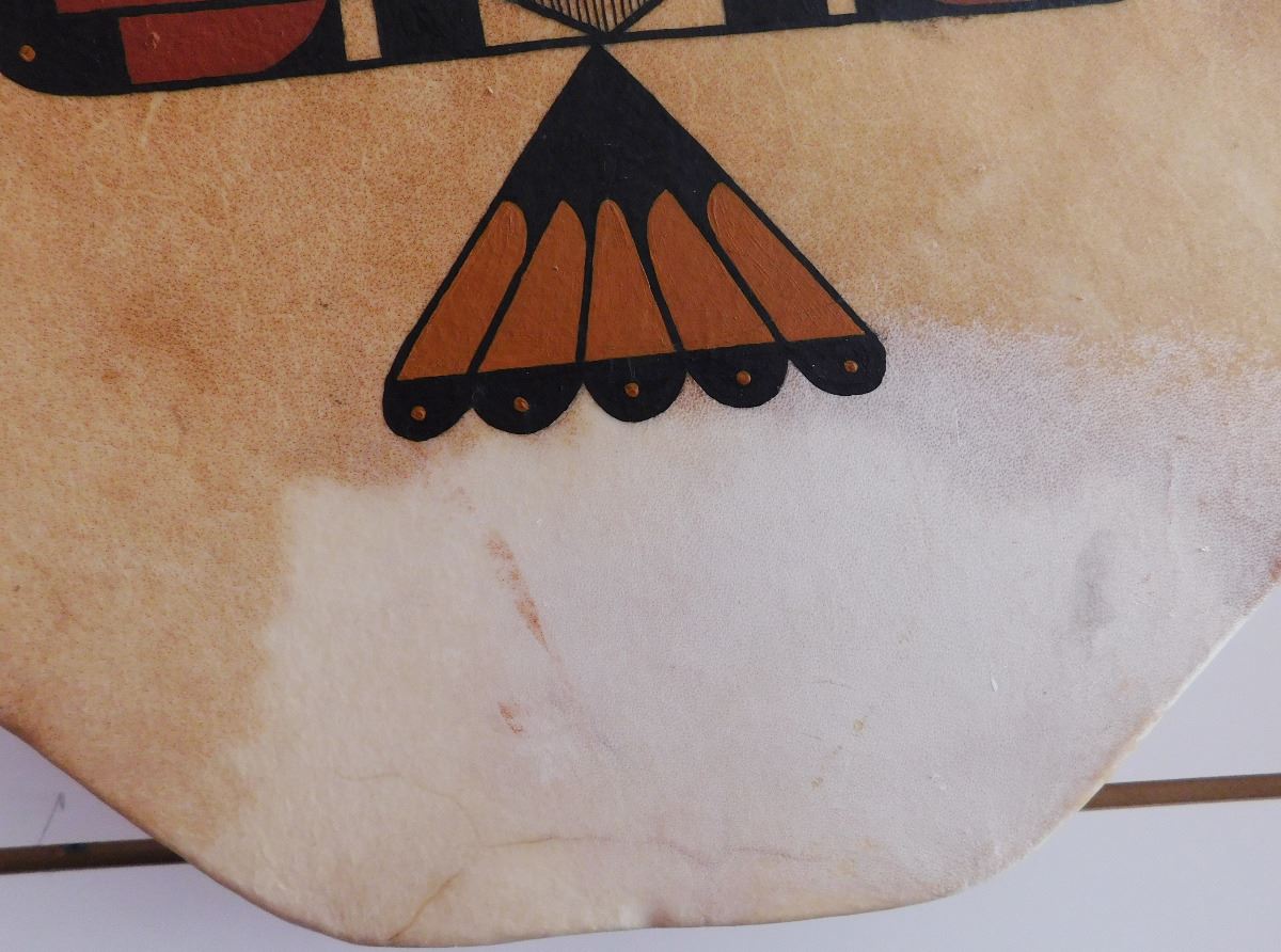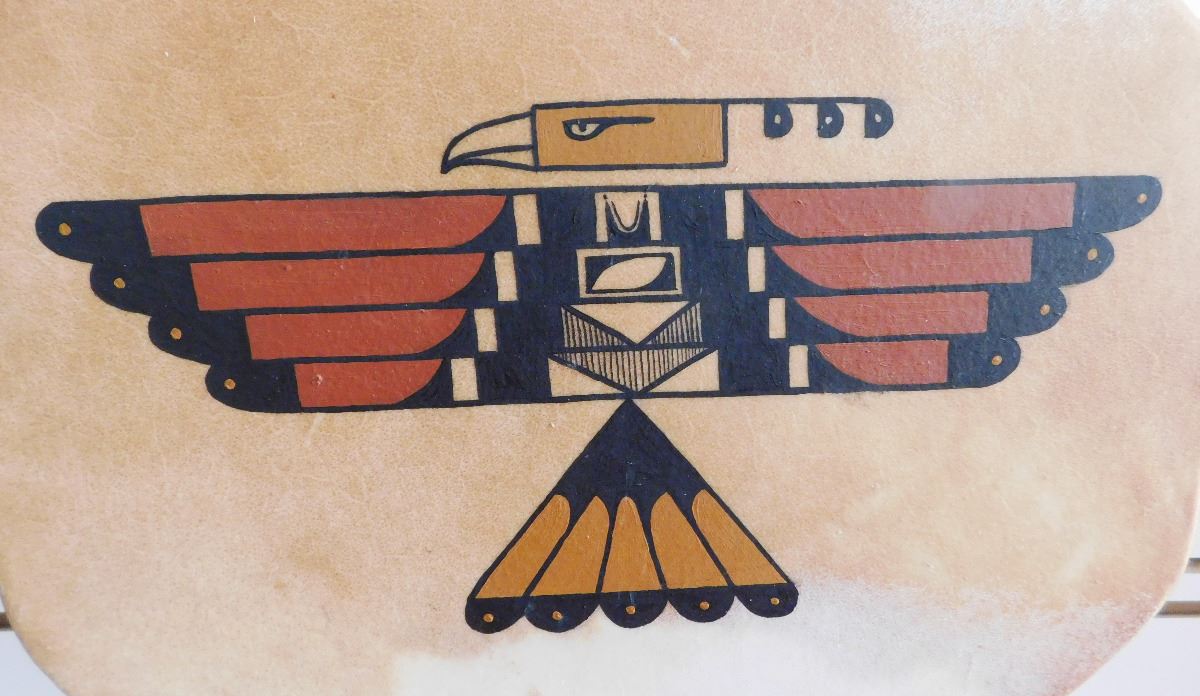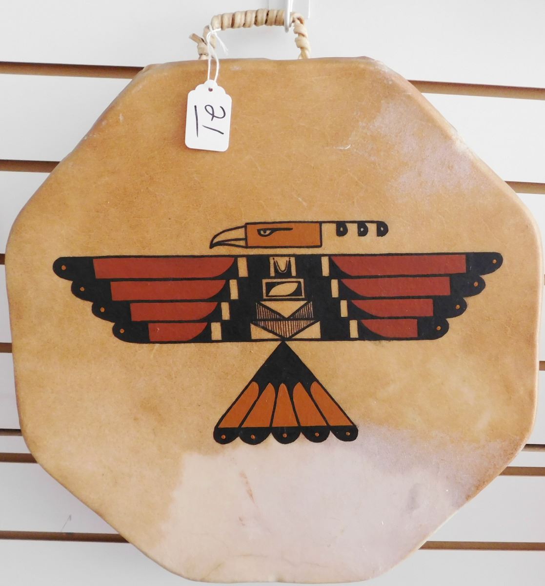 Nortwest Coast Drum, circa 1950s. Made of cedar and rawhide, this item measures 14" x 14" x 3". From British Columbia, Canada. Nice painting on drum, thunderbird design. Condition: Very good, see images. Shipping: $30.00.