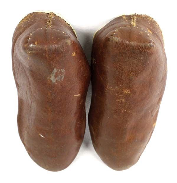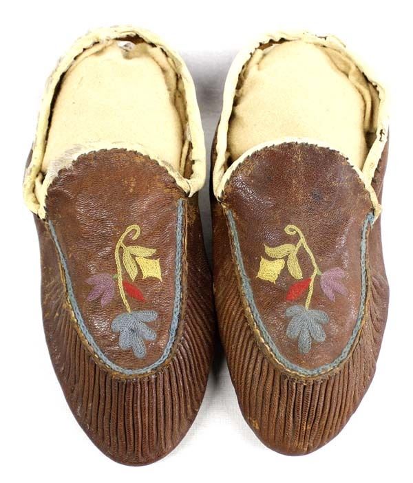 Antique Northwest Coast Embroidered Leather Slippers, measure 9''L from heel to toe, there was at one time fur trim however most of it has worn off