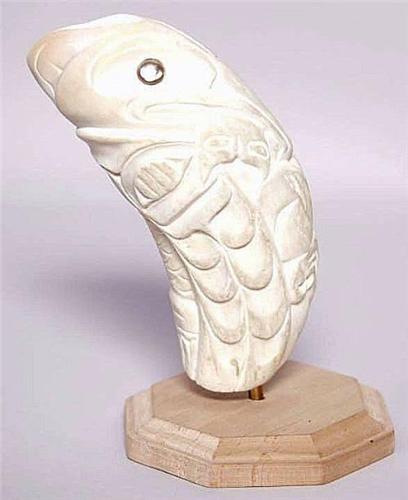 Northwest Coast Finely Carved Whale Tooth with Shamanic Design and Abalone Inlay, Monogram and Label By Elsie John 6" H. Fine Condition Not Allowed To Ship To U.S.