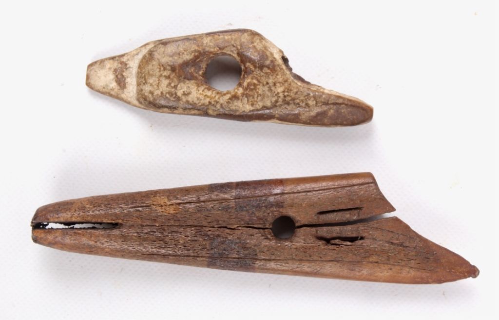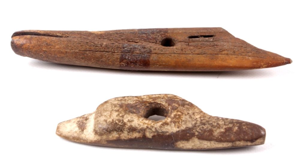 These are ancient Northwest Coast Native American handmade harpoon points. The lot features two fossilized ivory points. These measure 4.75" long and he other 3 1/8" long.