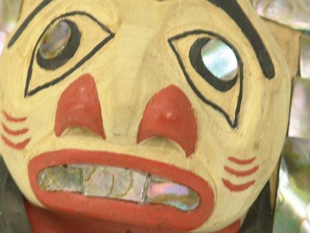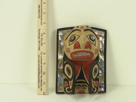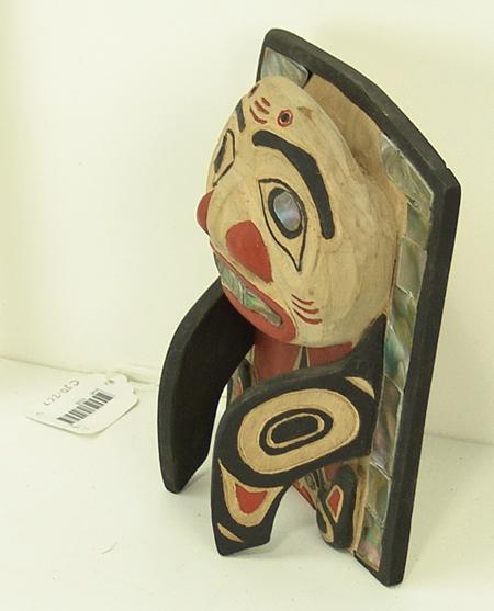 Circa 1980s, Traditional hand carved alderwood panel with humanoid faces, wings, and inlaid abalone edge. Good condition, unsigned. 7" x 5" From the Johnson Collection.