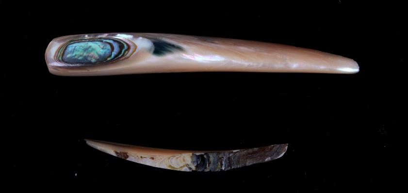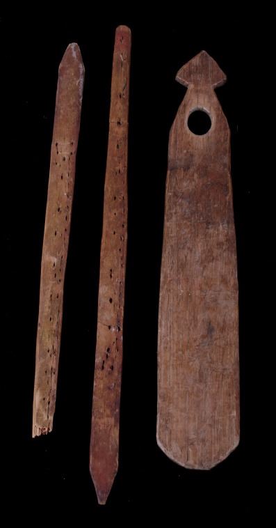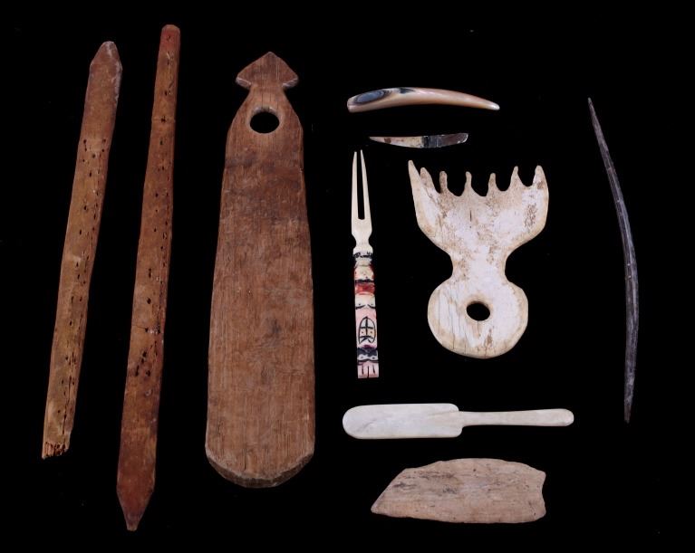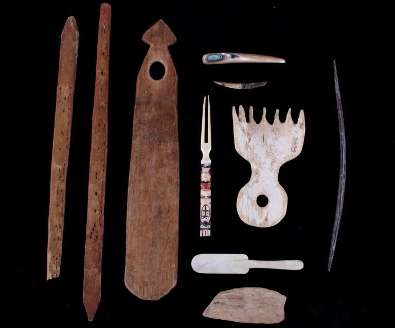 This is a collection of Northwest Coast Native American mammoth tool artifacts. Each piece is hand carved from bone and ancient walrus ivory, wood, and mammoth ivory . The tools include a comb and pick, as well as other pieces that are believed to have been used for fishing and to repair nets. All the pieces are in good condition. The longest piece (spear) measures 10.5" long.