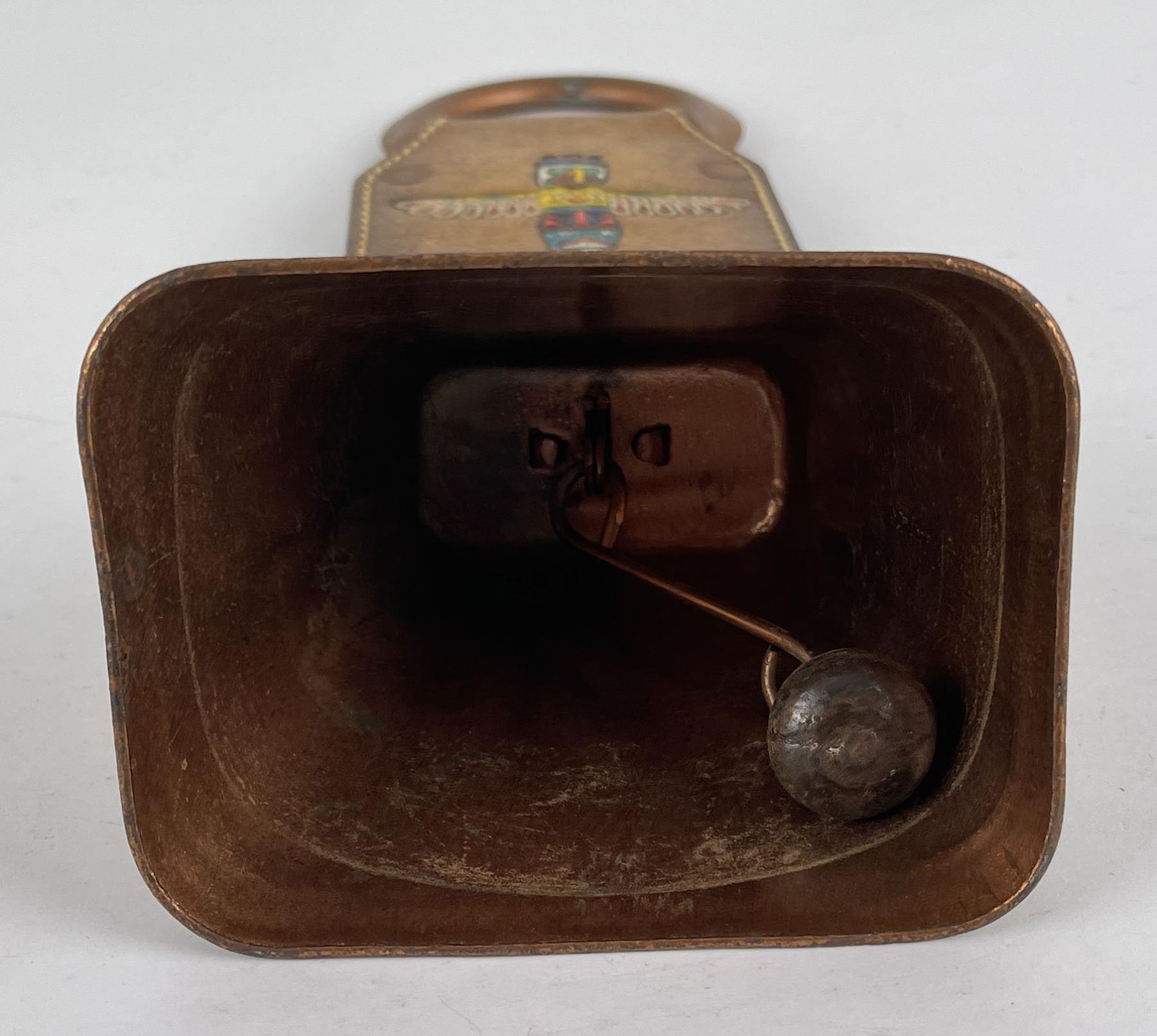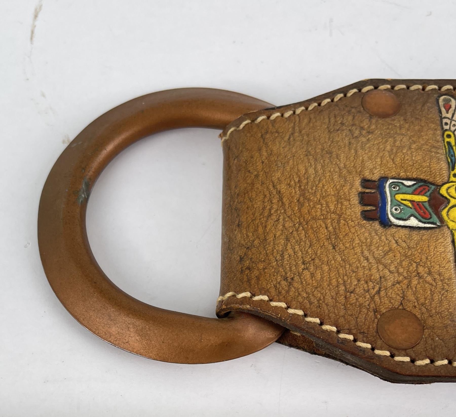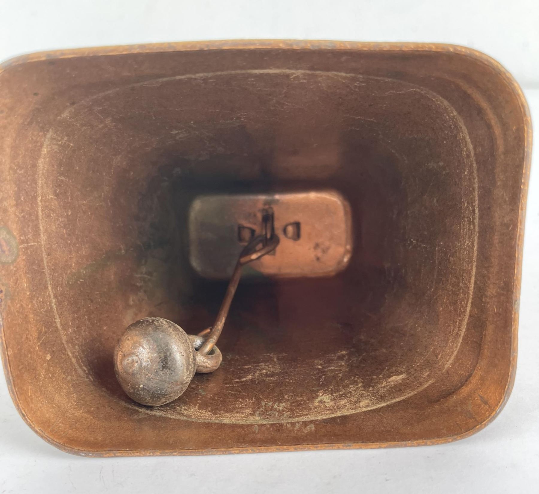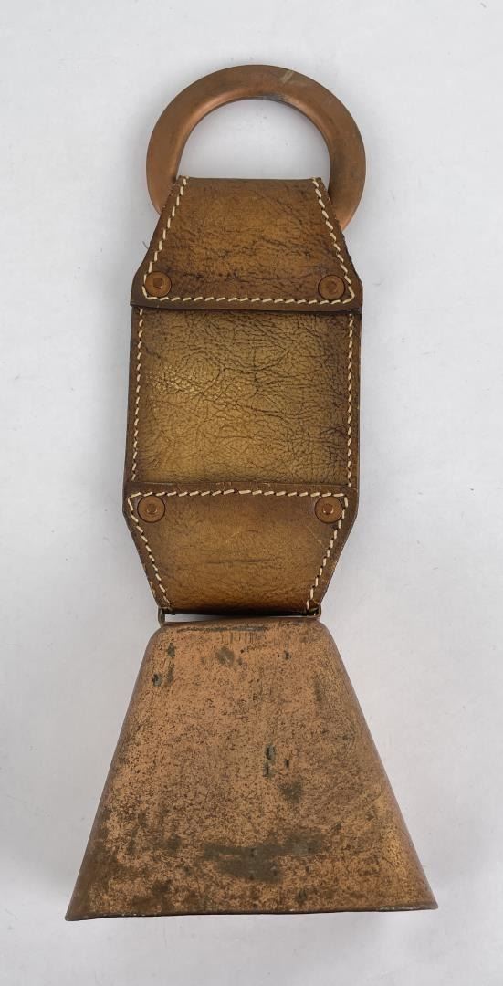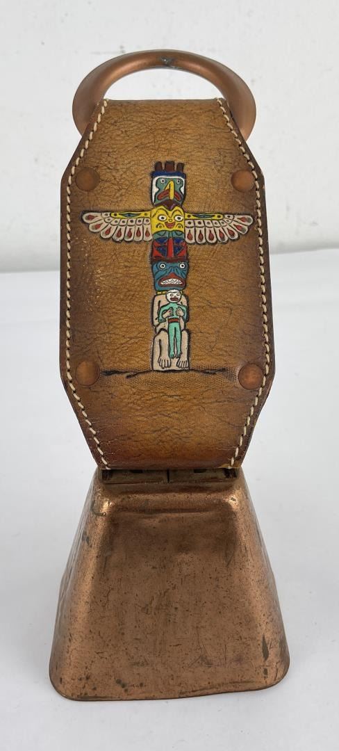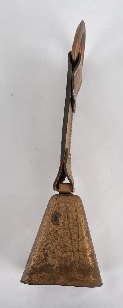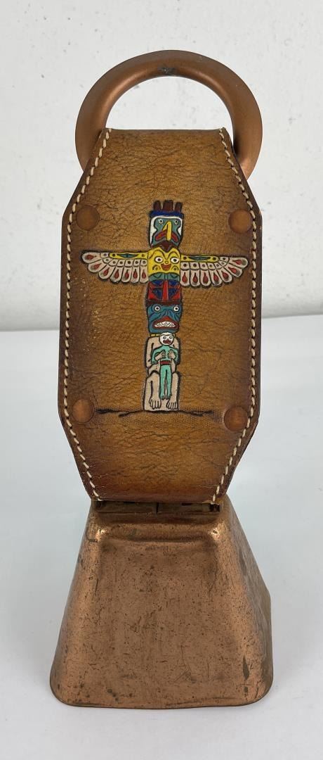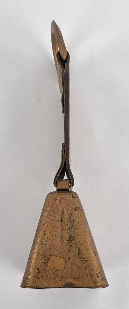 Very nice piece. Painted and decorated leather strap. Bell itself is 3 3/4" by 4 3/4".