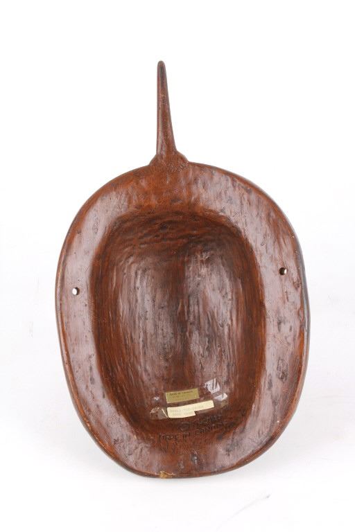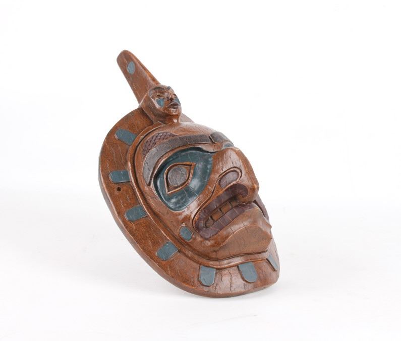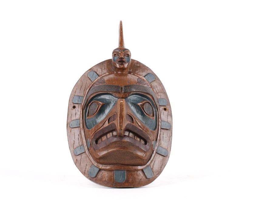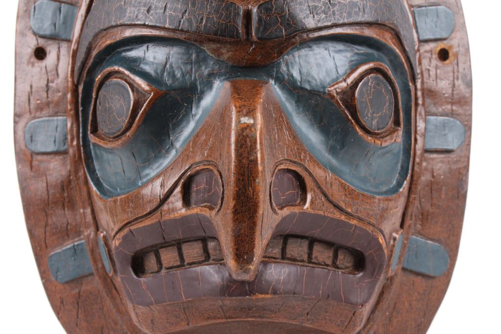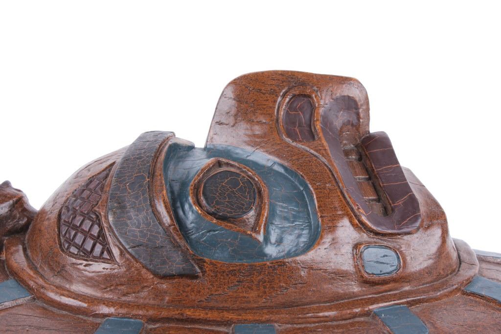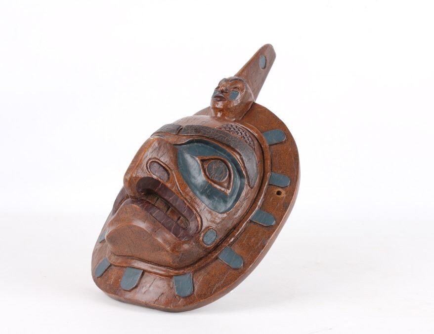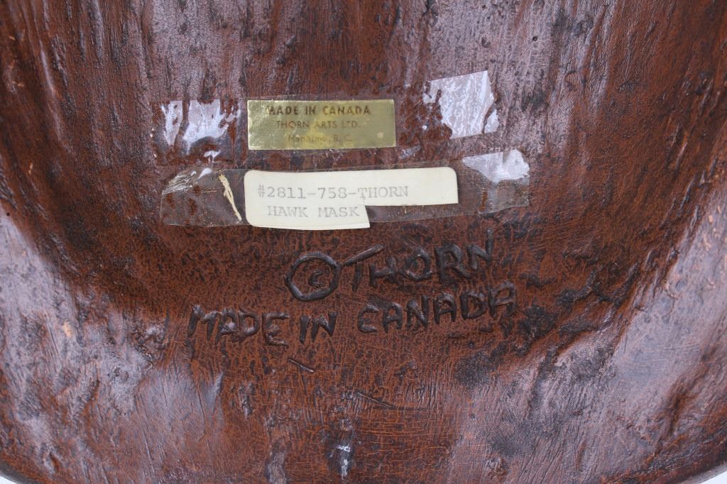 For your consideration is this Northwest Coast Indian Kwakiutl Thorn Hawk Mask. The mask shows good design and construction of the mask with good texturing and painting to the mask. It is signed by the artist and states it was made in Canada. The condition of this mask is good showing a slight chip to the bottom border but in good overall condition. The measurements of this mask is 16" x 9" x 5".