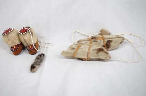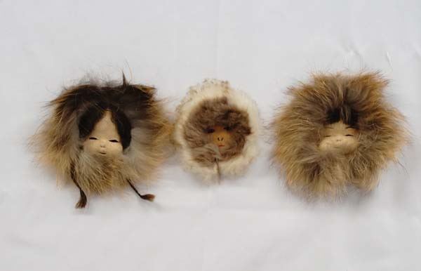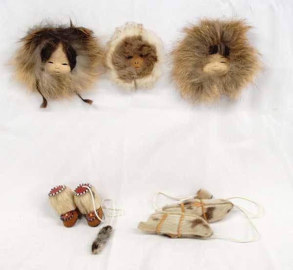 Native American Northwest Coast Inuit Masks and Yo Yos. 3 masks and 2 yo yos all have Seal & Caribou fur. Largest mask is 3''.