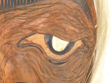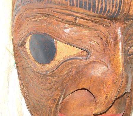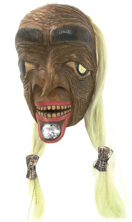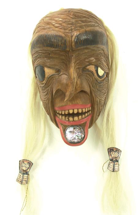 Circa Late 1900s, Rare hand carved "Old Woman" mask with abalone inlay labrette, long white hair, and traditional "copper" hair ties. Excellent condition, signed. Excellent detail. 13" x 8-1/2"