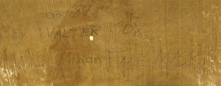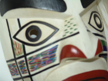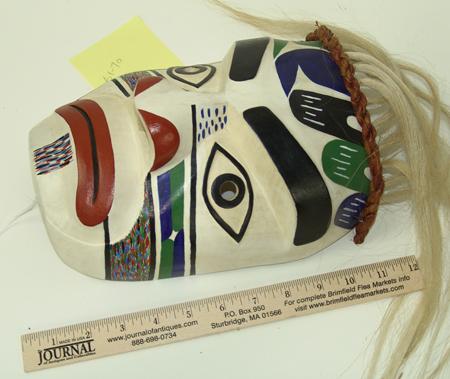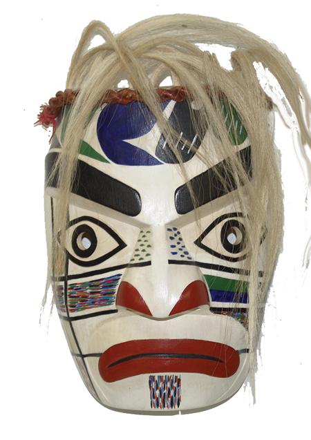 Circa 1987, Classic hand carved and painted cedarwood mask with horsehair and woven cedar bark brown band. Very good condition. 10" x 8" x 5-1/2" From the Burks Collection.
