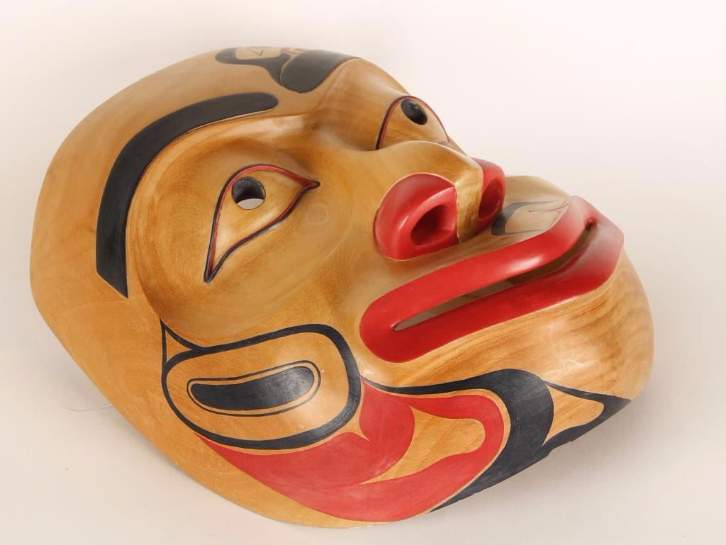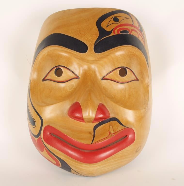 Solid wood construction. Red and black hand painted details on a natural wood smiling face. Measures 20x22. In overall excellent condition.