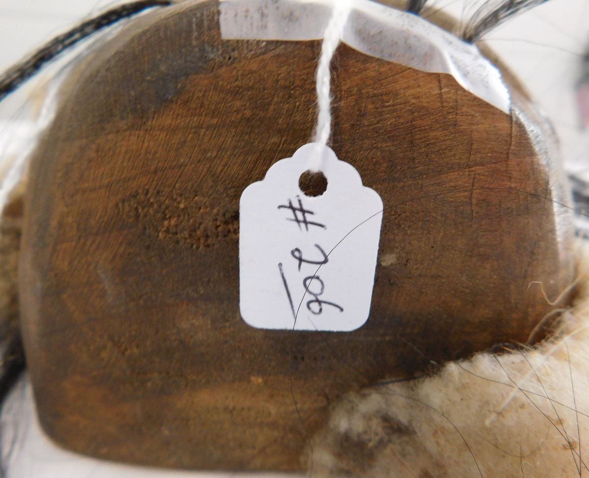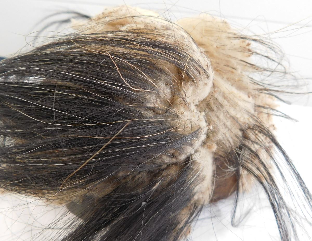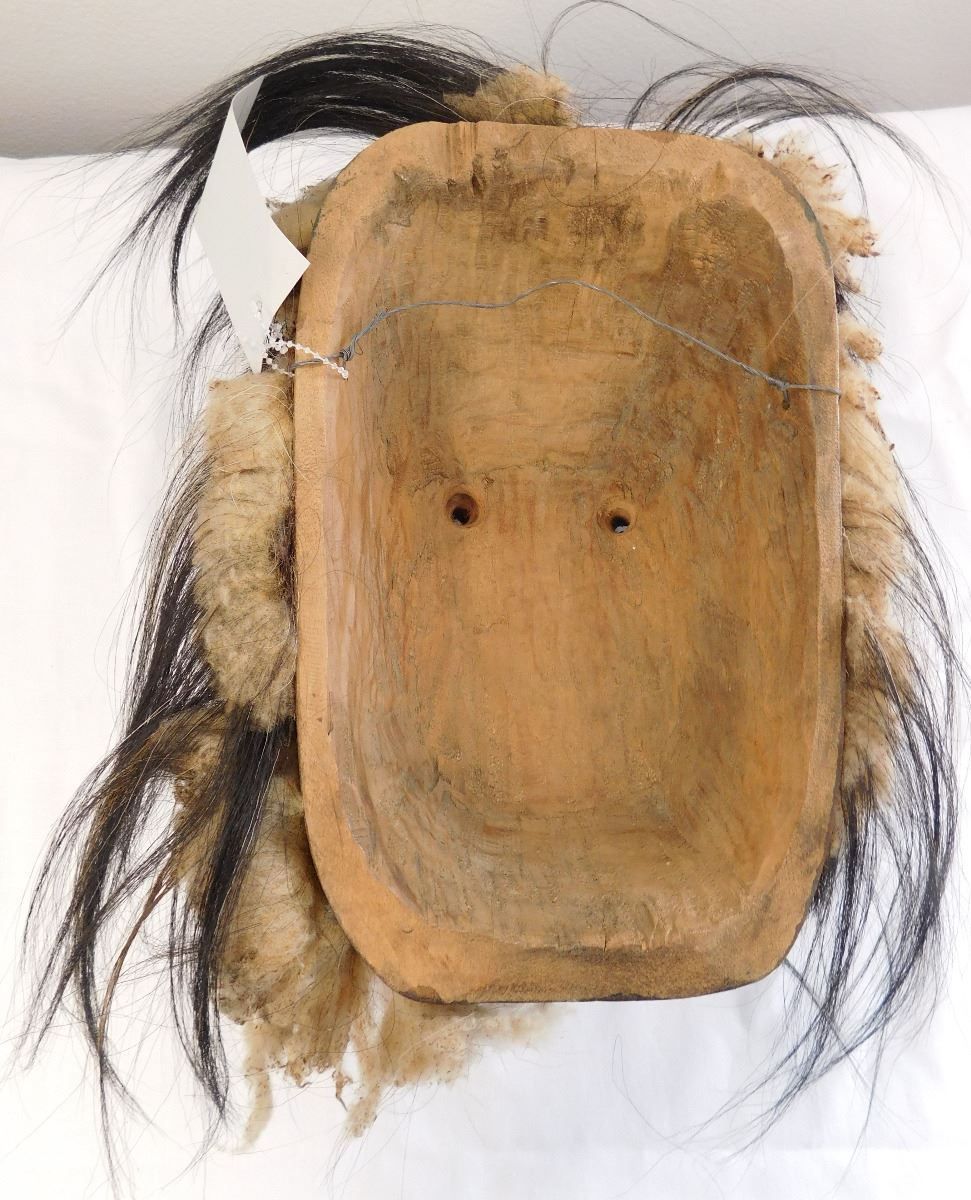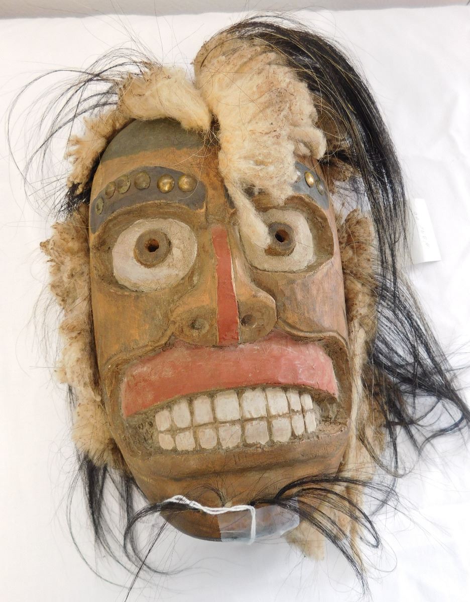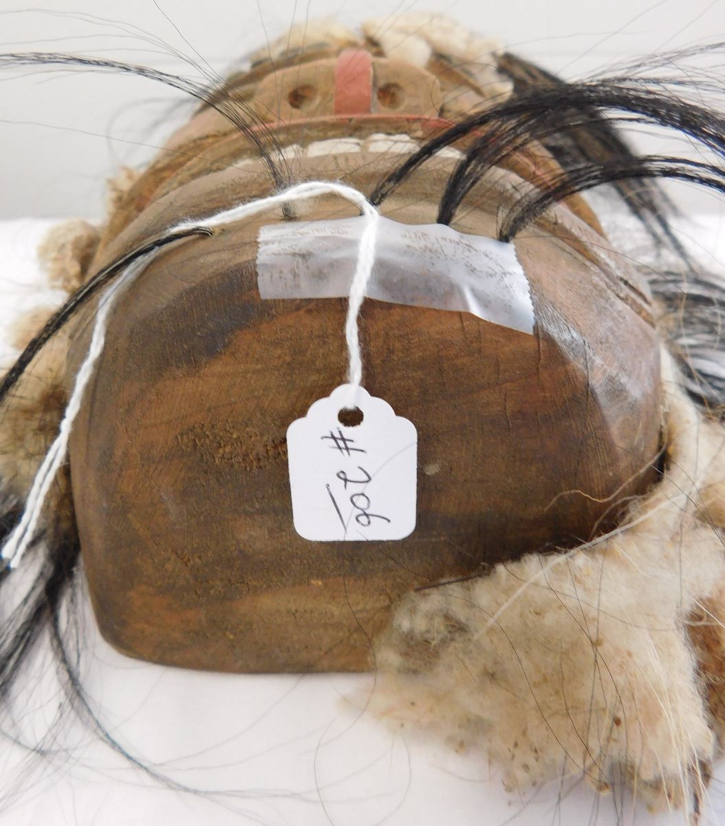 This item is fromTlingit Tribe in Canada and is a nice older mask measuring 10x7x5 inches. It is made from wood, wool, human hair, paint and brass tacks. Shipping: $50.00 This item came from an estate of long time collector in the San Diego Area