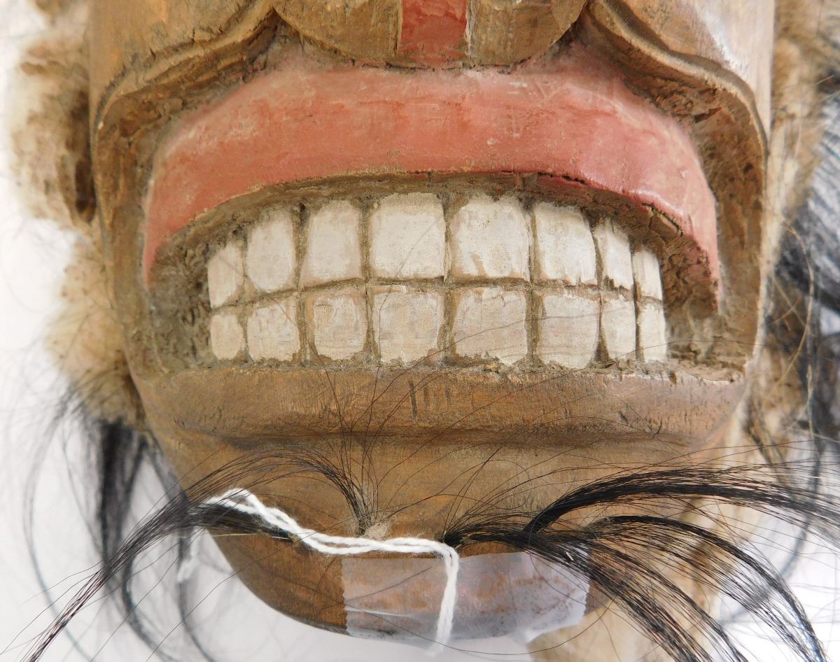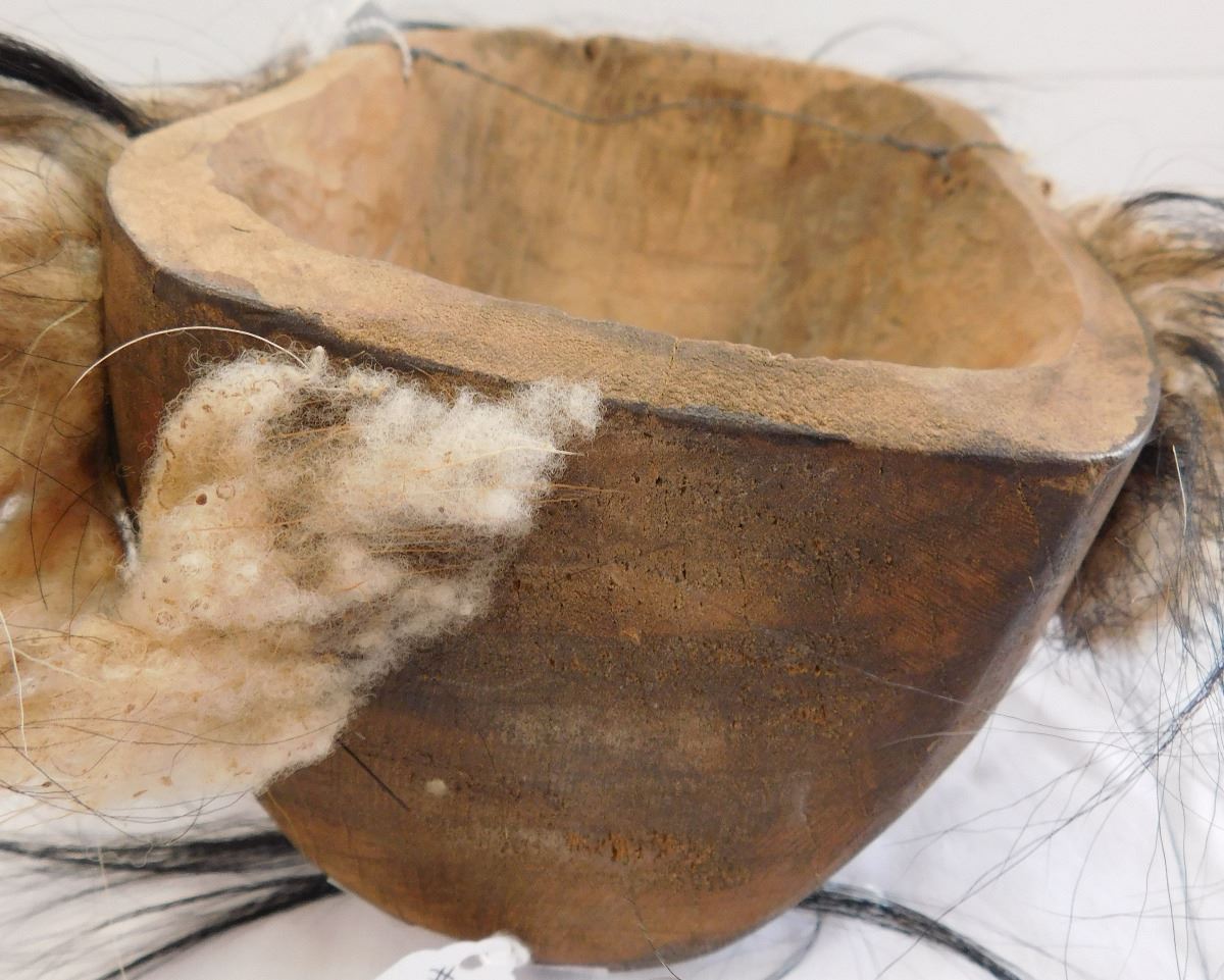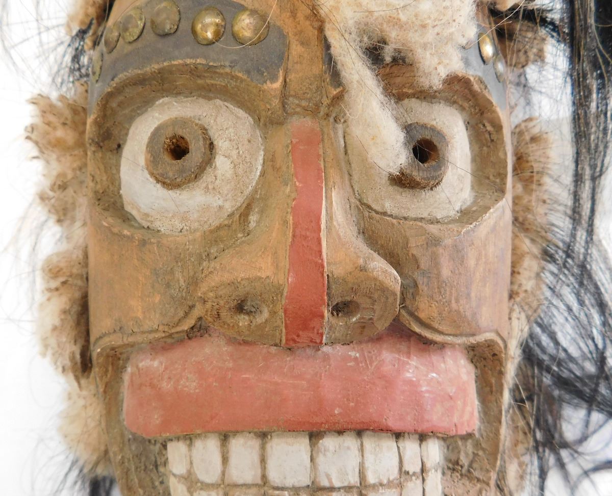 This item is fromTlingit Tribe in Canada and is a nice older mask measuring 10x7x5 inches. It is made from wood, wool, human hair, paint and brass tacks. Shipping: $50.00 This item came from an estate of long time collector in the San Diego Area
