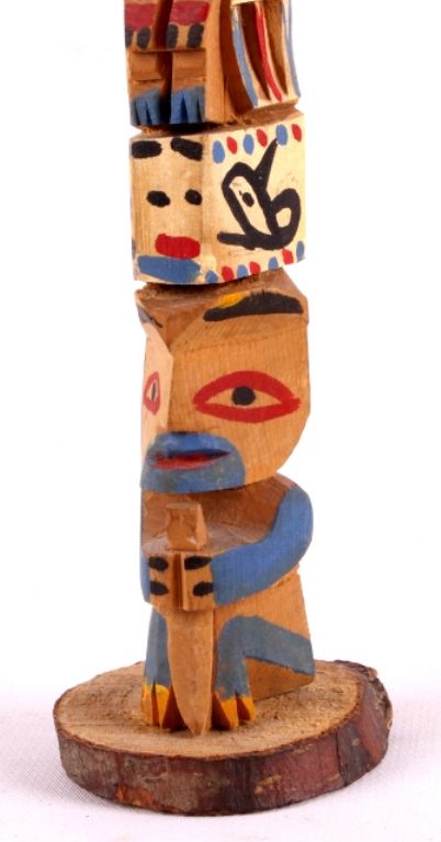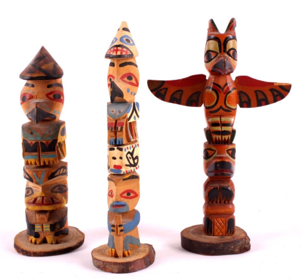 This is a collection of Northwest Coast Native American totem poles. Each totem is created to tell a story. These were made in the traditional fashion using birds, animals, and other natural images. They have been hand carved and painted. Each totem is in very good condition. The largest on is 5" wide and is 8.5" tall.