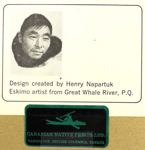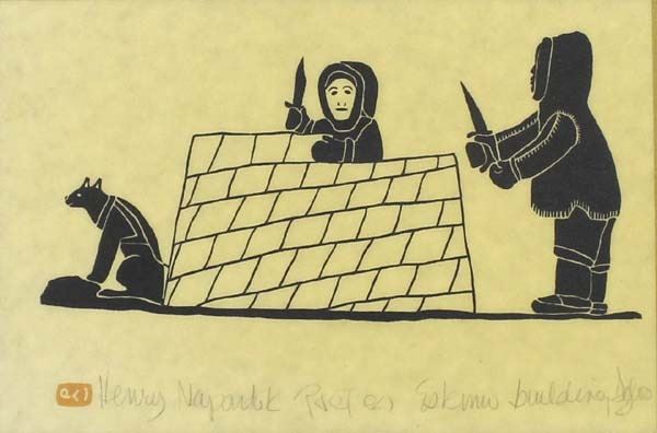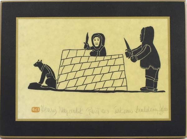 Northwest Coast Print ''Eskimos Building Igloo'' by Henry Napartuk of Great Whale River, P.Q., print is on wood plaque, visual measures 6.5'' x 9.5'' and framed measurement 12'' x 8.75''