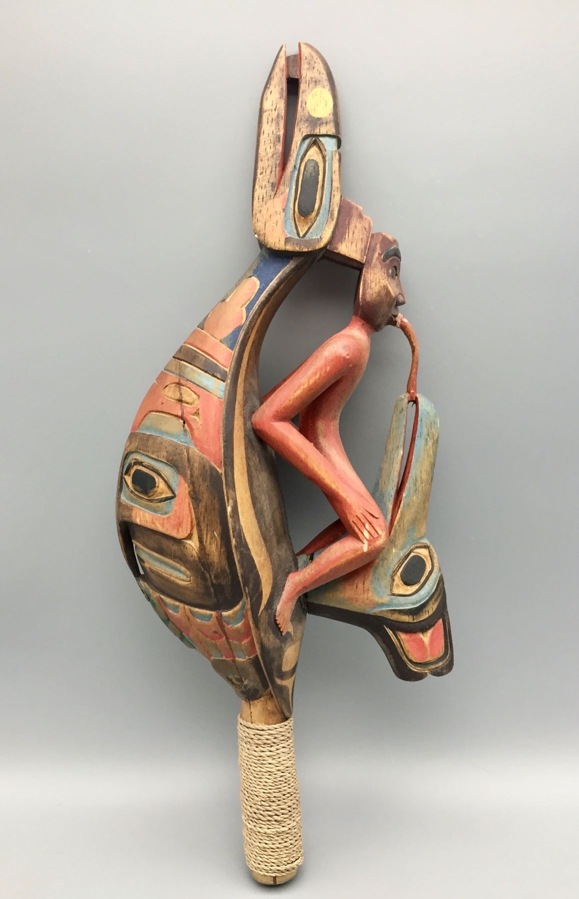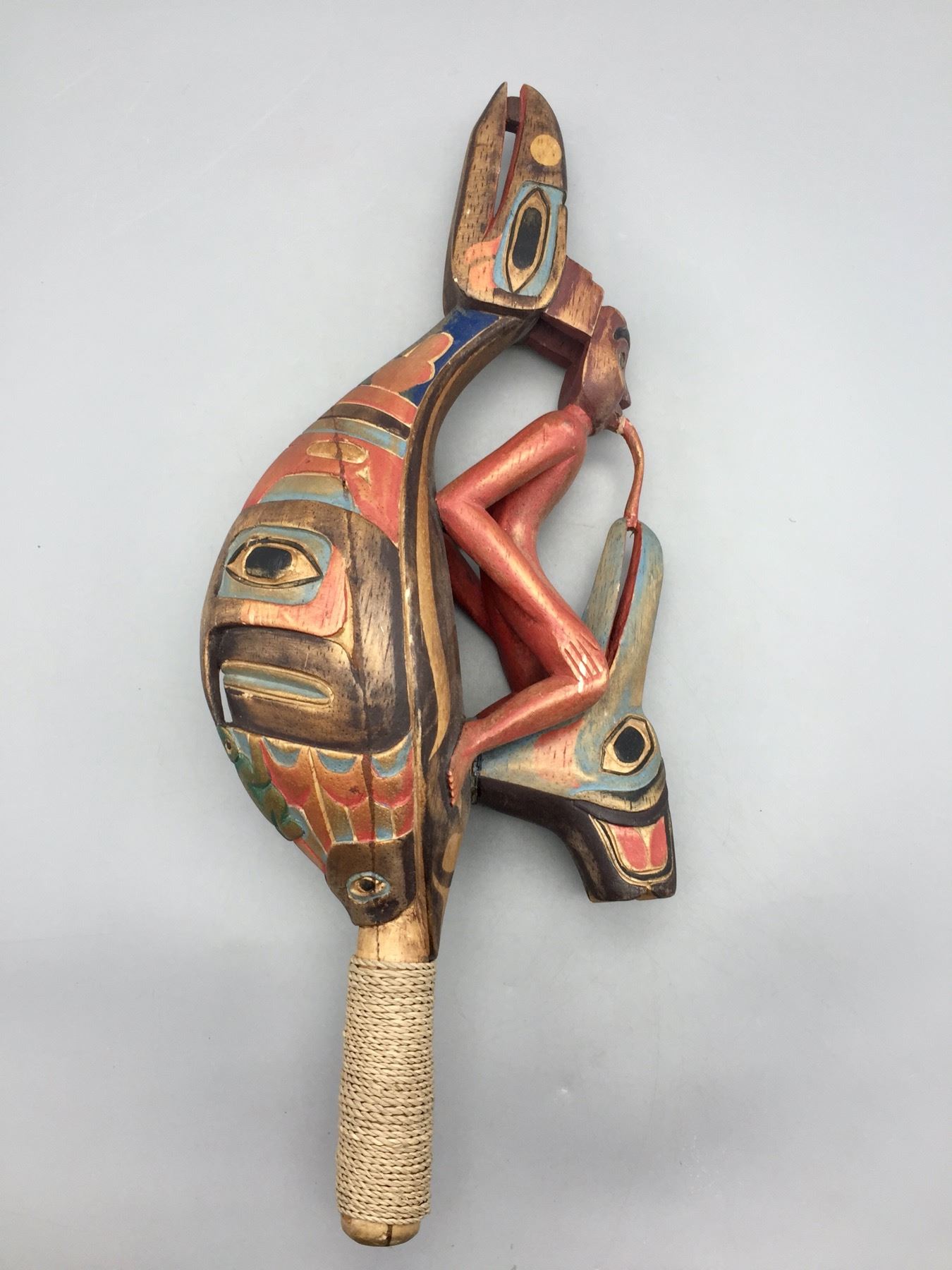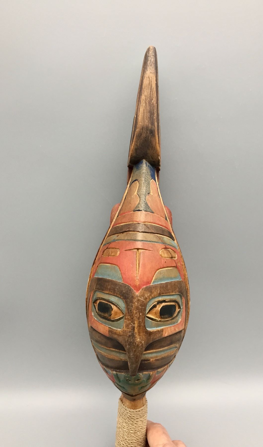 Description: For sale in this lot is a Northwest Coast rattle featuring hand carved and hand painted designs. This is a nice older mask, but it does show evidence of an old repair. Maker: Unknown. Approx. Age: Vintage. Size: 6-3/4 inches w x 17-1/2 inches long. Condition: Pretty good for its age, normal wear expected and does show an old repair. Please look closely at the pictures - they are an important part of our description. Shipping: There will be a $8 handling, packaging fee for shipping this lot. The actual cost of postage will be added on top of that.