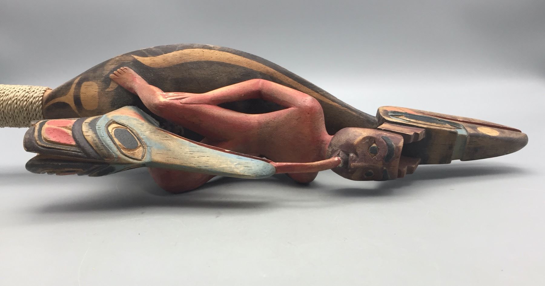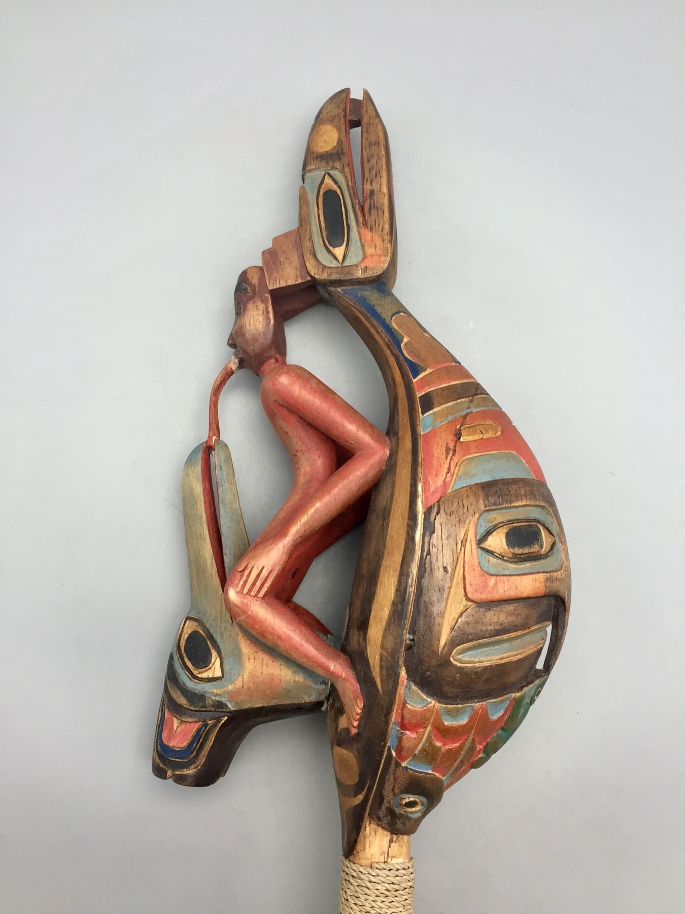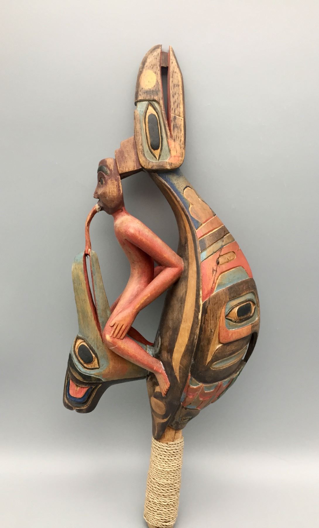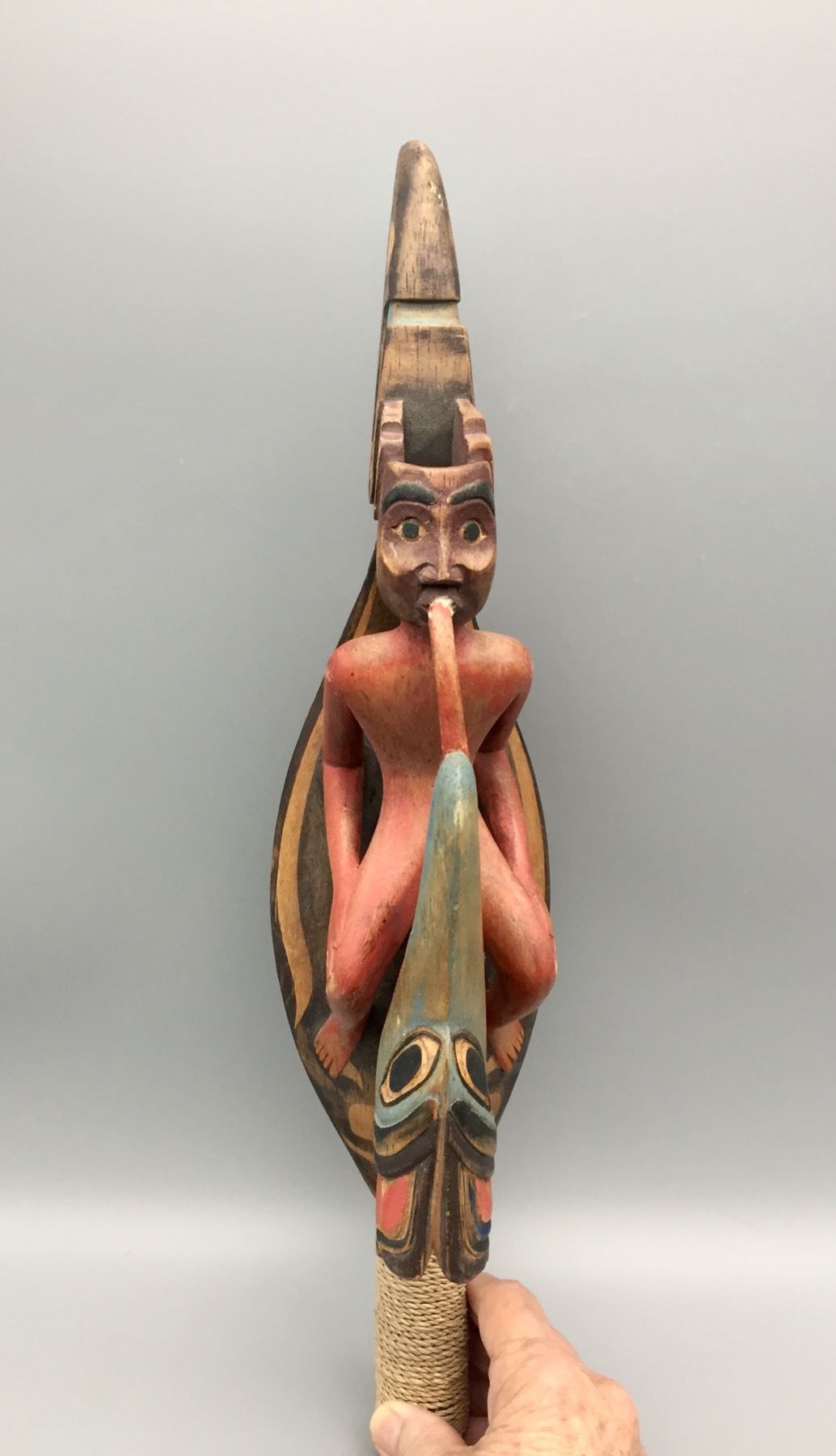 Description: For sale in this lot is a Northwest Coast rattle featuring hand carved and hand painted designs. This is a nice older mask, but it does show evidence of an old repair. Maker: Unknown. Approx. Age: Vintage. Size: 6-3/4 inches w x 17-1/2 inches long. Condition: Pretty good for its age, normal wear expected and does show an old repair. Please look closely at the pictures - they are an important part of our description. Shipping: There will be a $8 handling, packaging fee for shipping this lot. The actual cost of postage will be added on top of that.