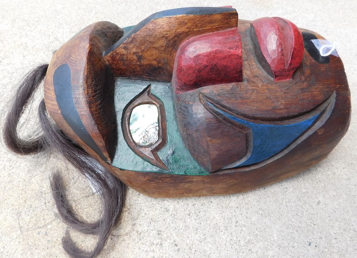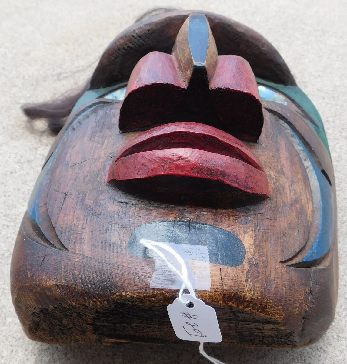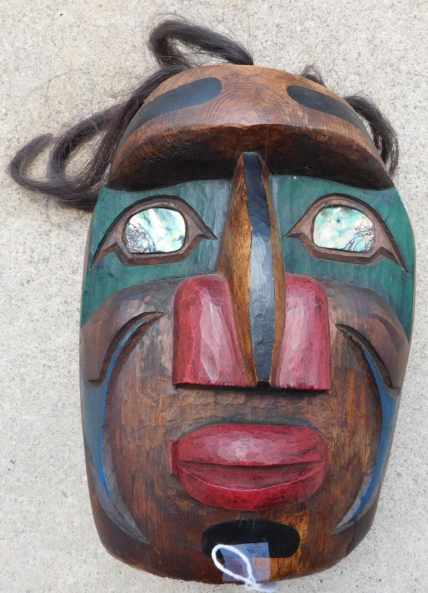 This NWC mask is made from wood, paint, abalone eyes and human hair. The item measures 11 1/2 x 9 x 4 1/2 inches and is from Canada - Haida Tribe. The item is signed by Telqua 99. Shipping: $50 This item came from estate of long time collector in the San Diego area.