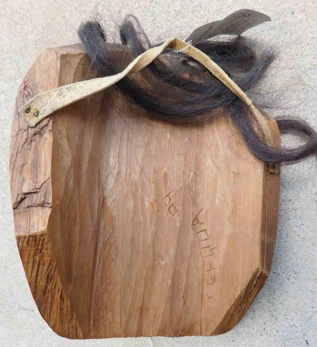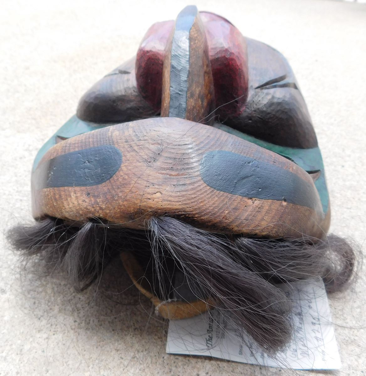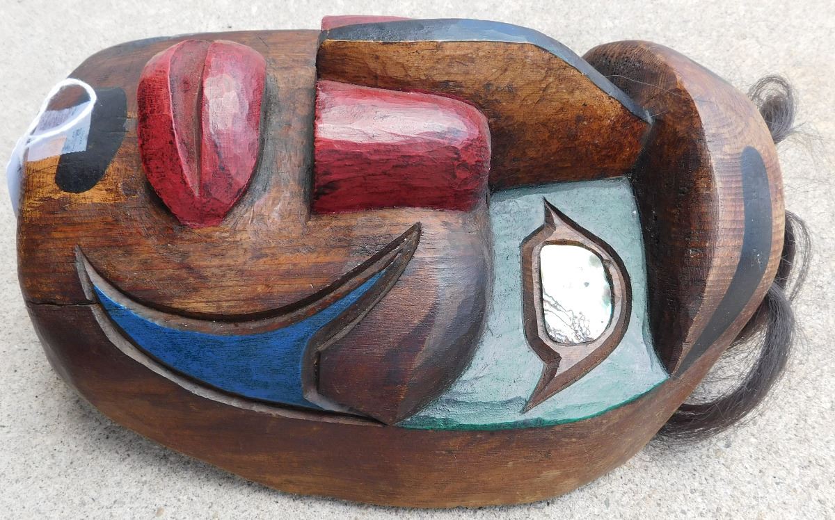 This NWC mask is made from wood, paint, abalone eyes and human hair. The item measures 11 1/2 x 9 x 4 1/2 inches and is from Canada - Haida Tribe. The item is signed by Telqua 99. Shipping: $50 This item came from estate of long time collector in the San Diego area.