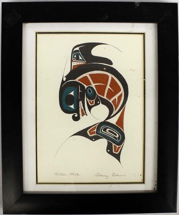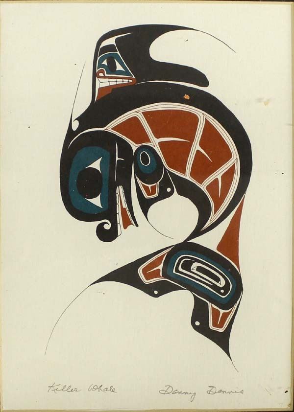 Northwest Coast Silkscreen Print ''Killer Whale'' by Danny Dennis, visual measures 8.5'' x 6'', framed and under glass, hand signed, FYI: ''A self-taught artist born in Port Essington, B.C., Danny Dennis is one of the rare Northwest Coast artists who produces original paintings. Born in 1951, Danny began his artistic career in 1978, also working in the mediums of gold, silver and ivory as well as silkscreen prints.''
