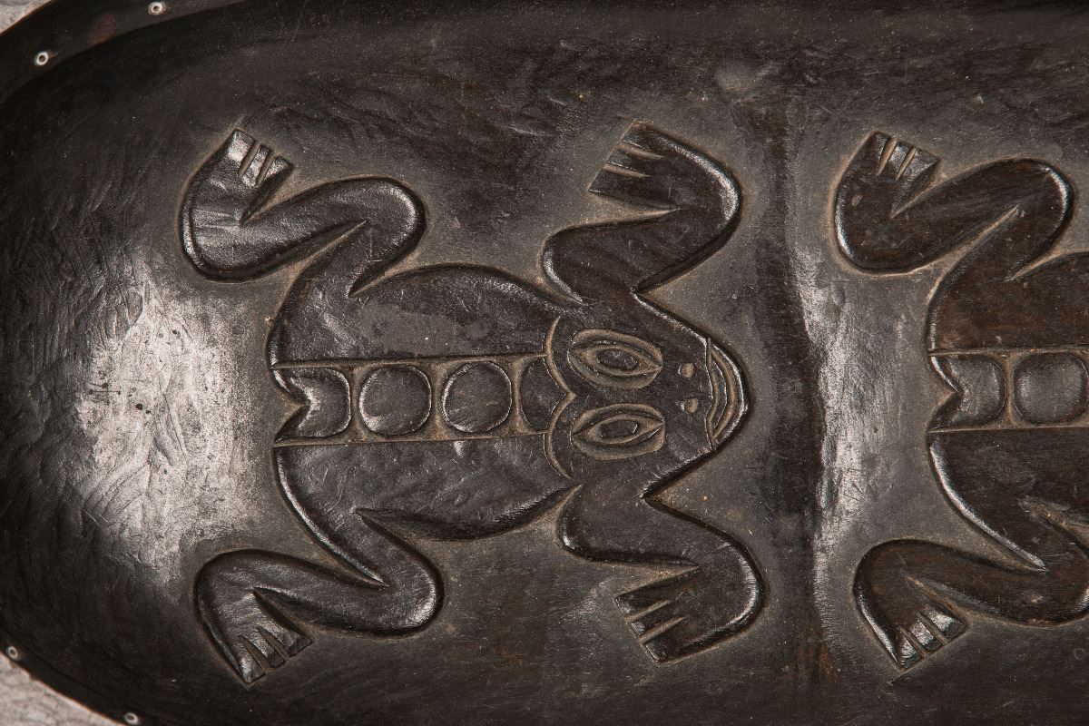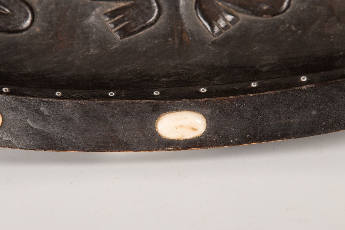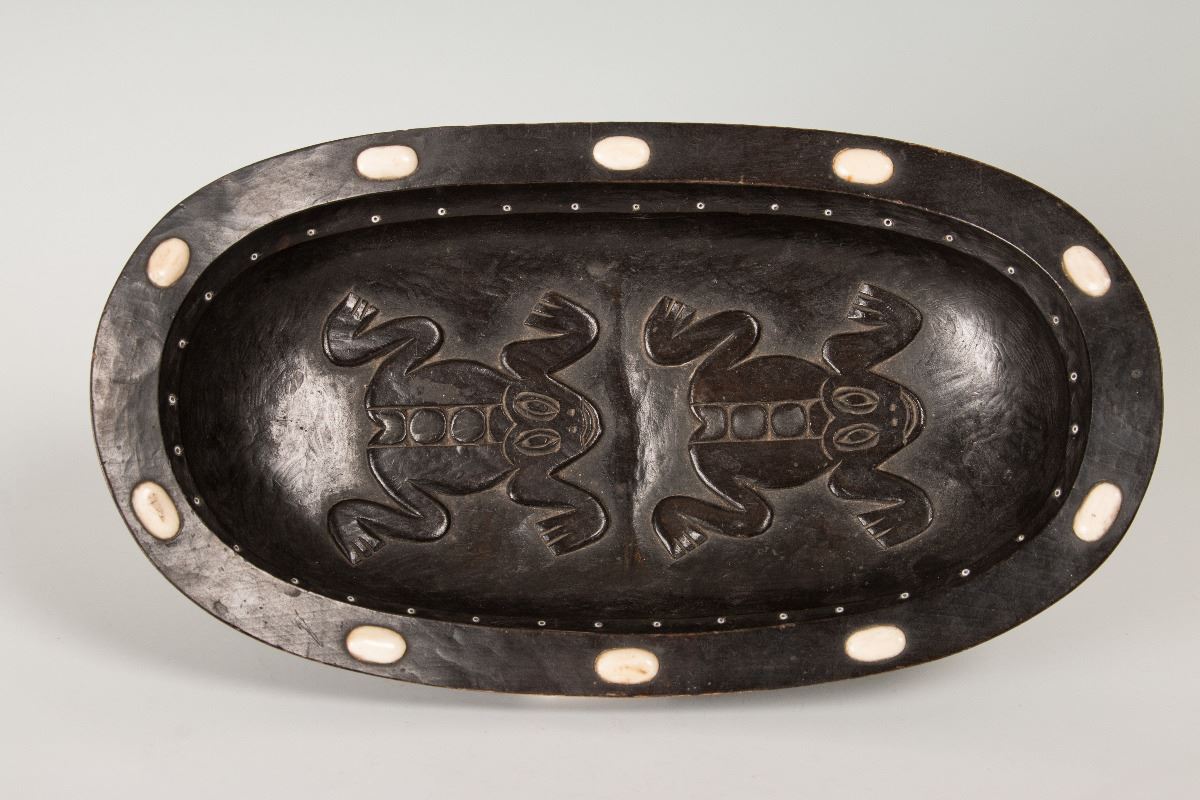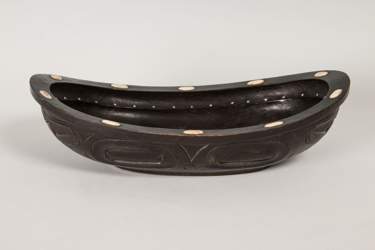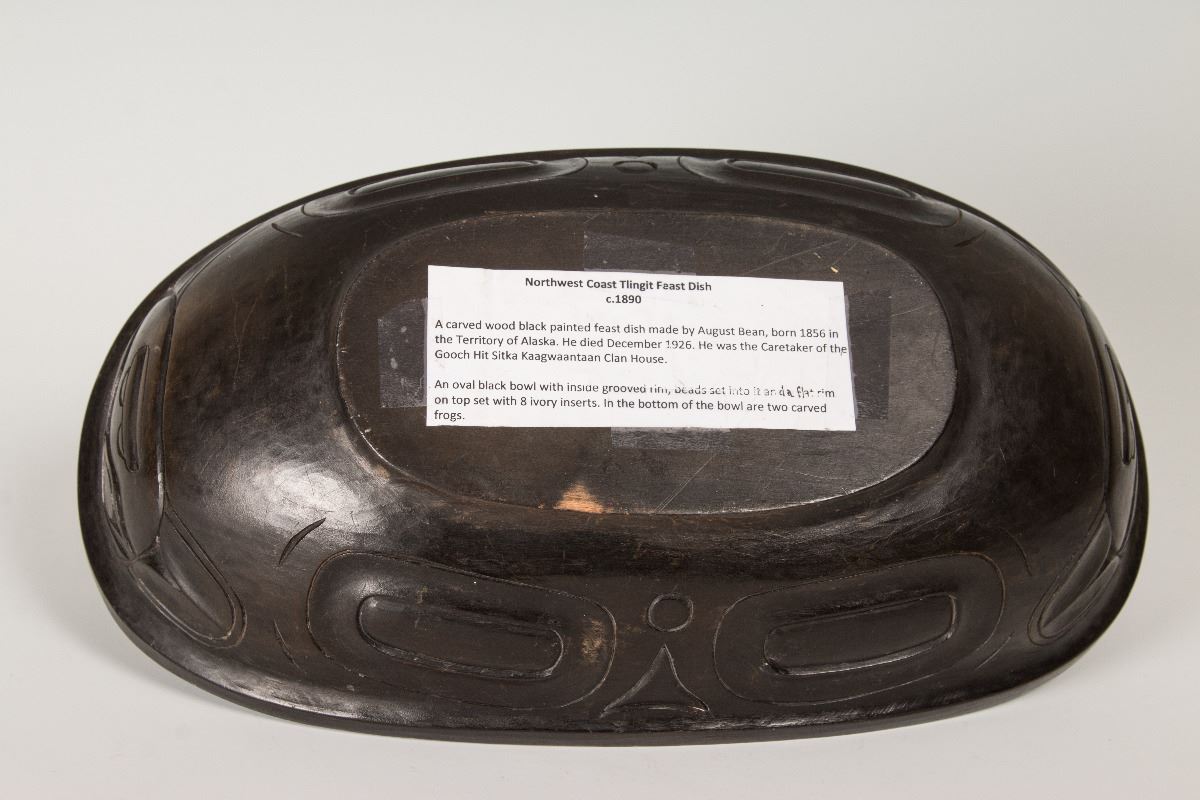Northwest Coast Tlingit Feast Dish. 8" x 13 ½" carved effigy bowl by August Bean (b.1856) and Rudolf Walton. Accented with inset Abalone eyes, ivory teeth and white beads. Sides show incised front flippers and totemic faces and the bowl is ringed with oval ivory inserts. Circa 1890.