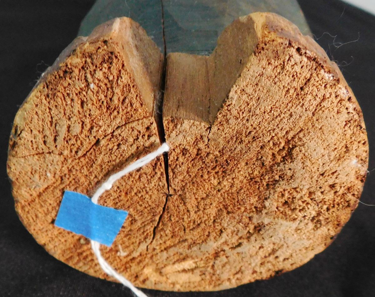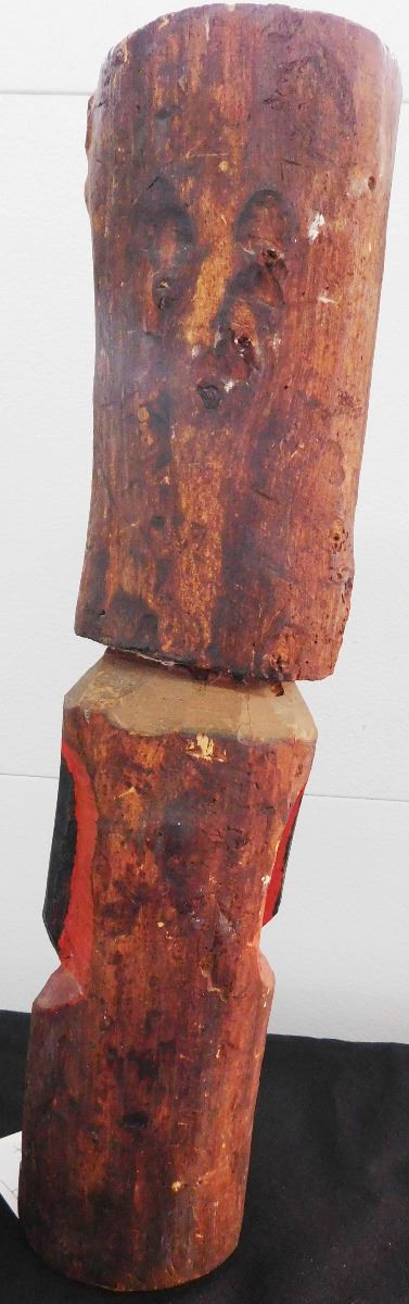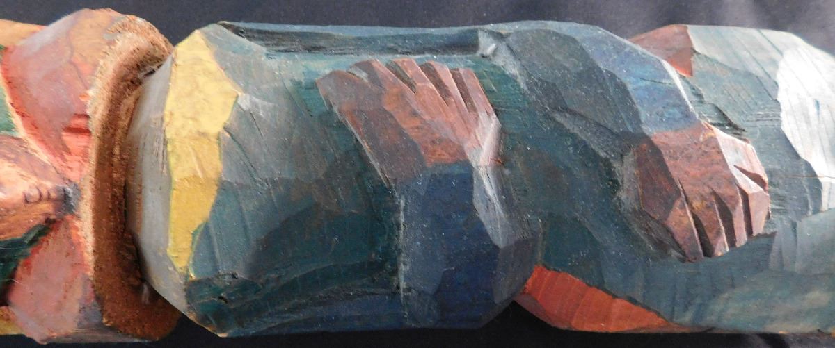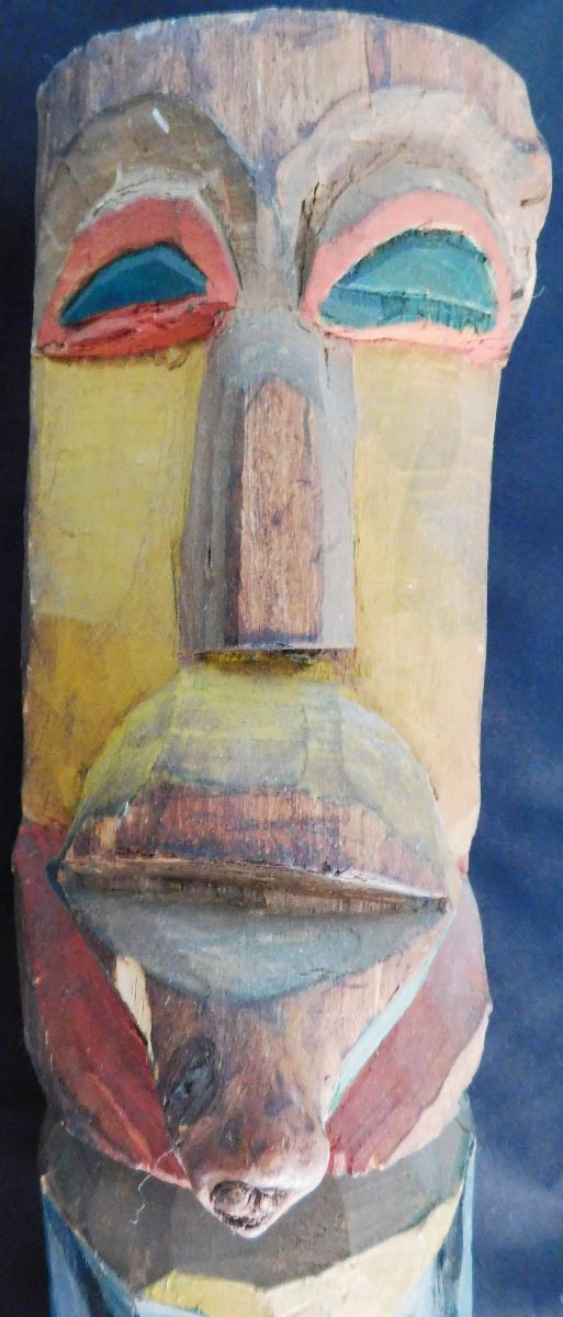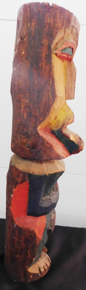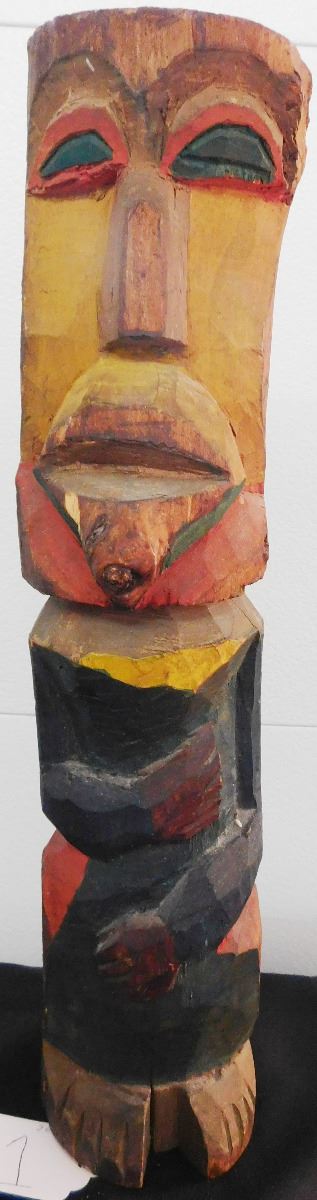 Northwest Coast Totem, circa 1910. Made of wood and paint and measuring 18" tall with a circumference of 13". NWC. Fine polychrome carving has a natural knot in the wood which was formed into a tongue. Condition: Good, see images. Shipping: $22.