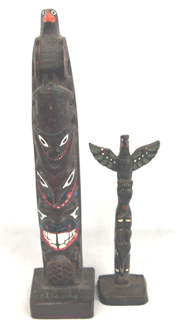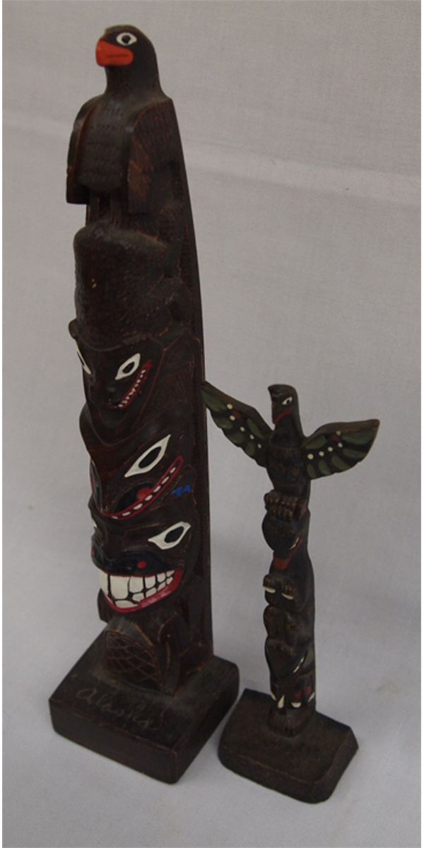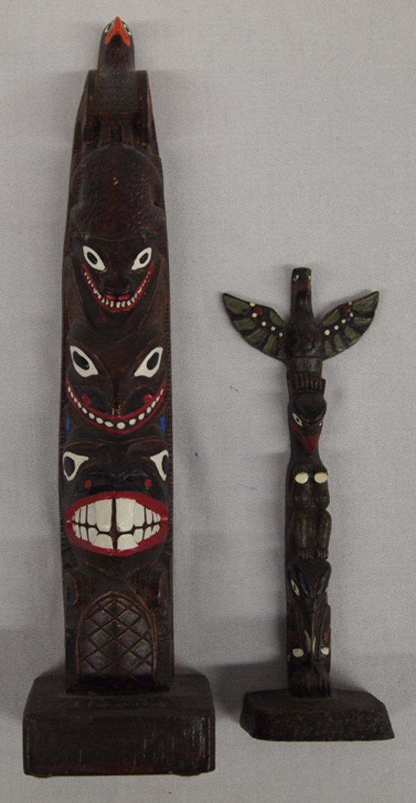 Northwest Coast Trading Post Wooden Totem Poles, tallest measures 12''H x 2.75''W, both have hand painted details, the largest one is marked Alaska on base