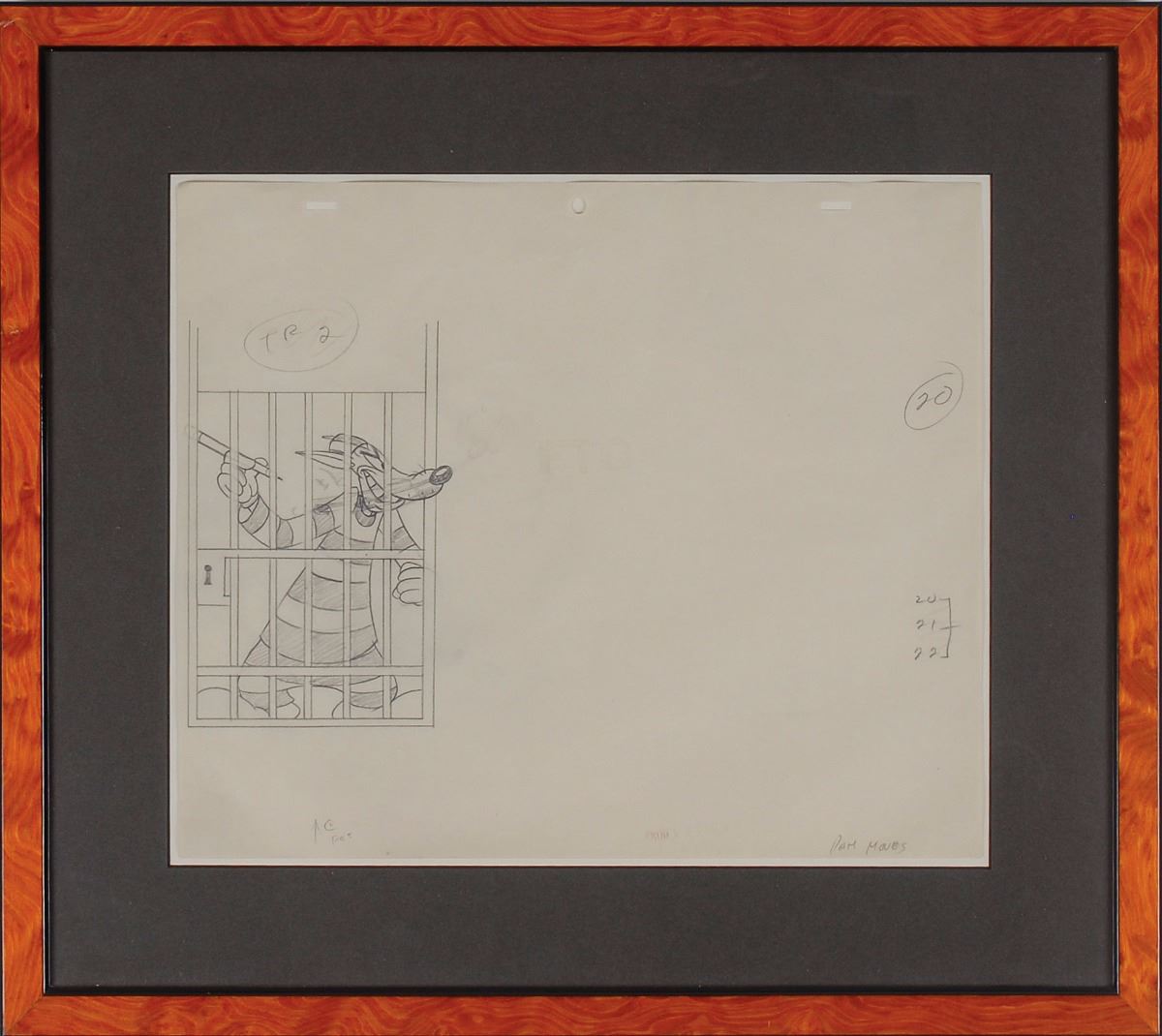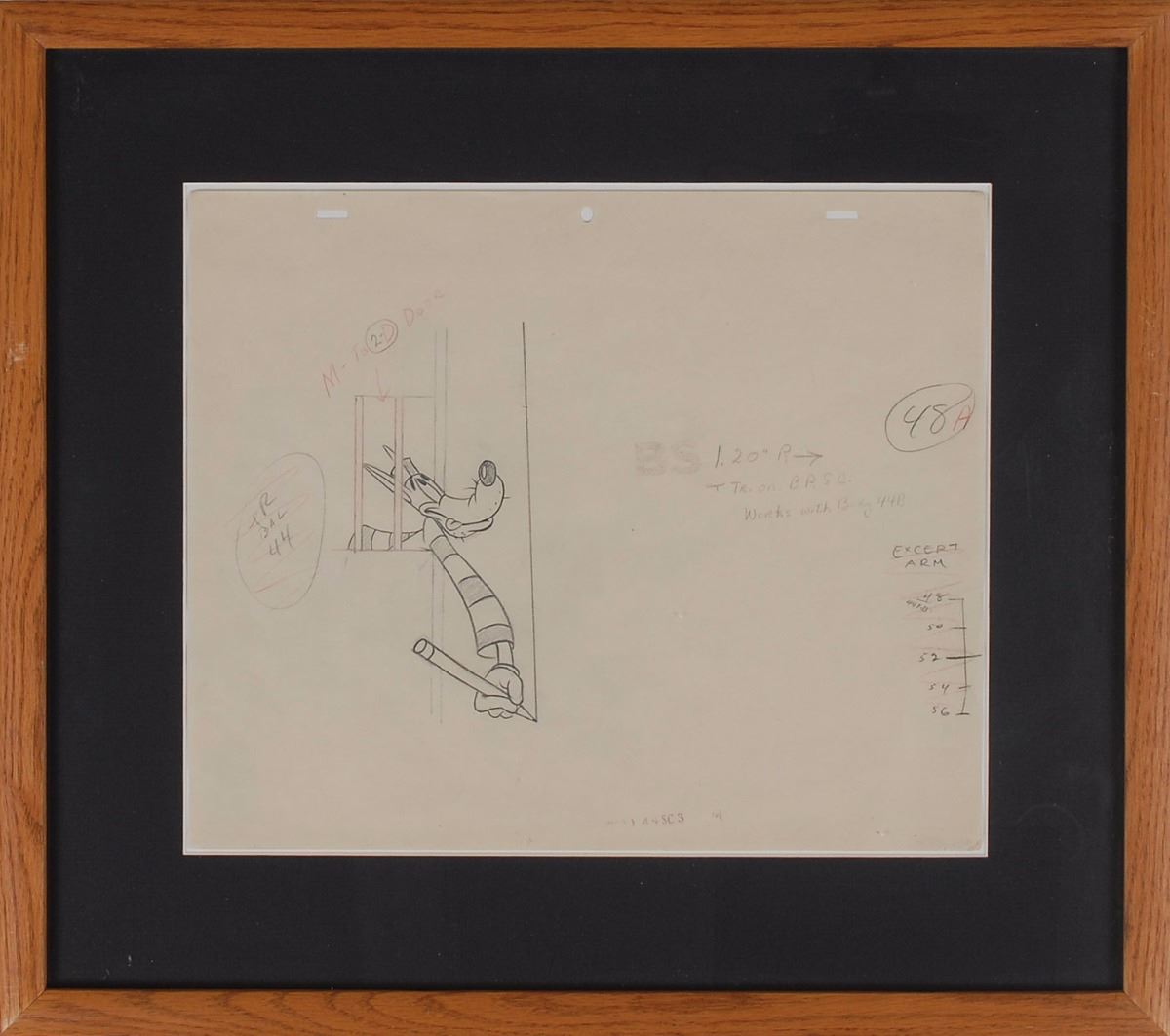 (MGM, 1946) Pair of production drawings of Wolfie breaking out of prison from the cartoon Northwest Hounded Police, showing the classic Tex Avery character drawing his escape from his jail cell. Accomplished in graphite and colored pencil on untrimmed sheets of 12.5 x 10.5 animation paper. Images measure about 4 x 6. Individually matted and framed. In overall fine condition.