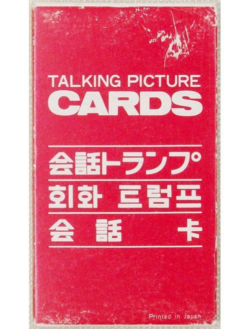This is a pack of vintage Northwest Orient "Talking Picture" playing cards. A 52-card deck with two jokers. Each card has a written English, Japanese, Korean, and Chinese version of various tourist questions and phrases, such as Where can I get a taxi?, Take me to the airport, I don't understand, and Thank you. There also is an illustration on each, such as a hotel, clock, or airplane. Printed in Japan. SIZE: Approx. 2.5" x 4.5".