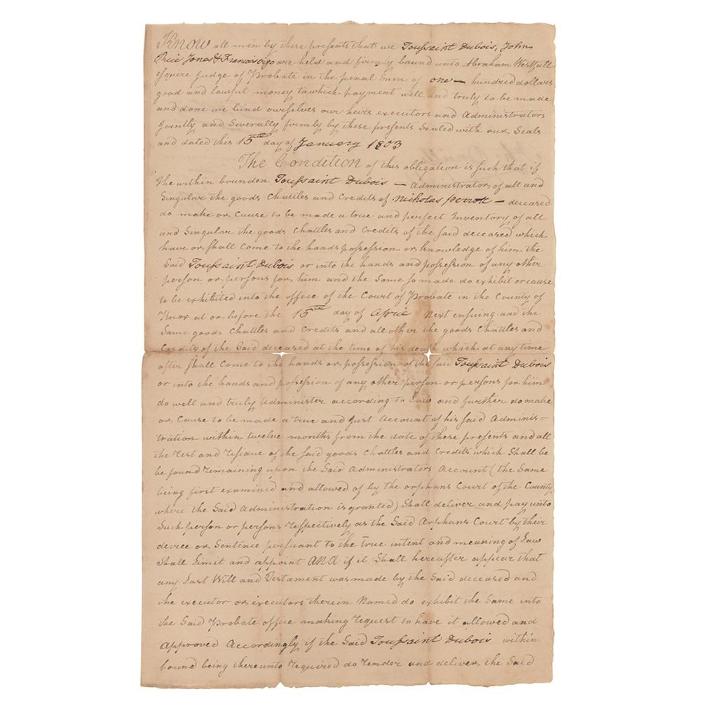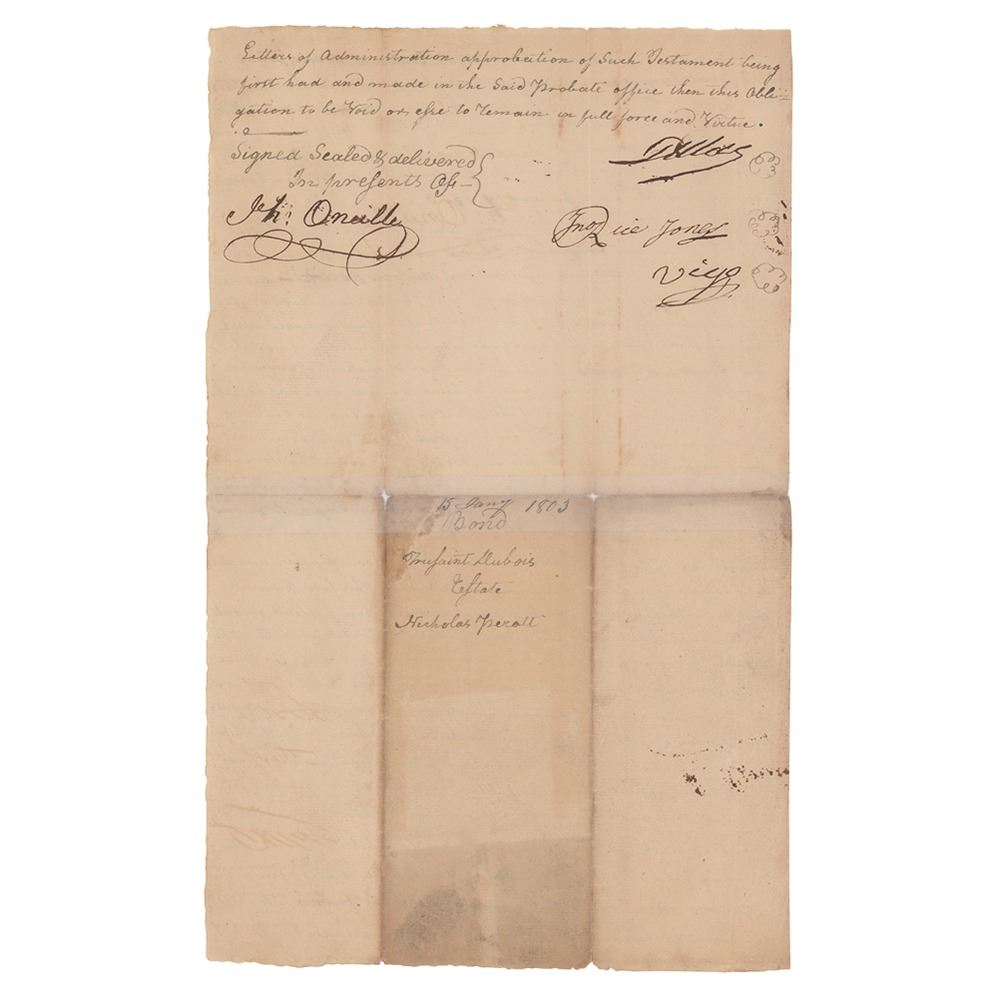 Manuscript DS, signed “Vigo,” one page both sides, 8 x 13, January 15, 1803. Document regarding the penal sum of $100 to be paid by Toussaunt Dubois, John Rice Jones, and Francis Vigo to probate judge Abaraham Westphall, in regards to "a true and perfect inventory of all and singular the goods chattels and credits" of the deceased Nicholas Perrott. Signed at the conclusion in bold black ink by Vigo, and countersigned by Rice and Dubois. In very good condition, with light stains, splitting to the ends of folds, and complete separation along the central horizontal fold repaired on the reverse with archival tape.