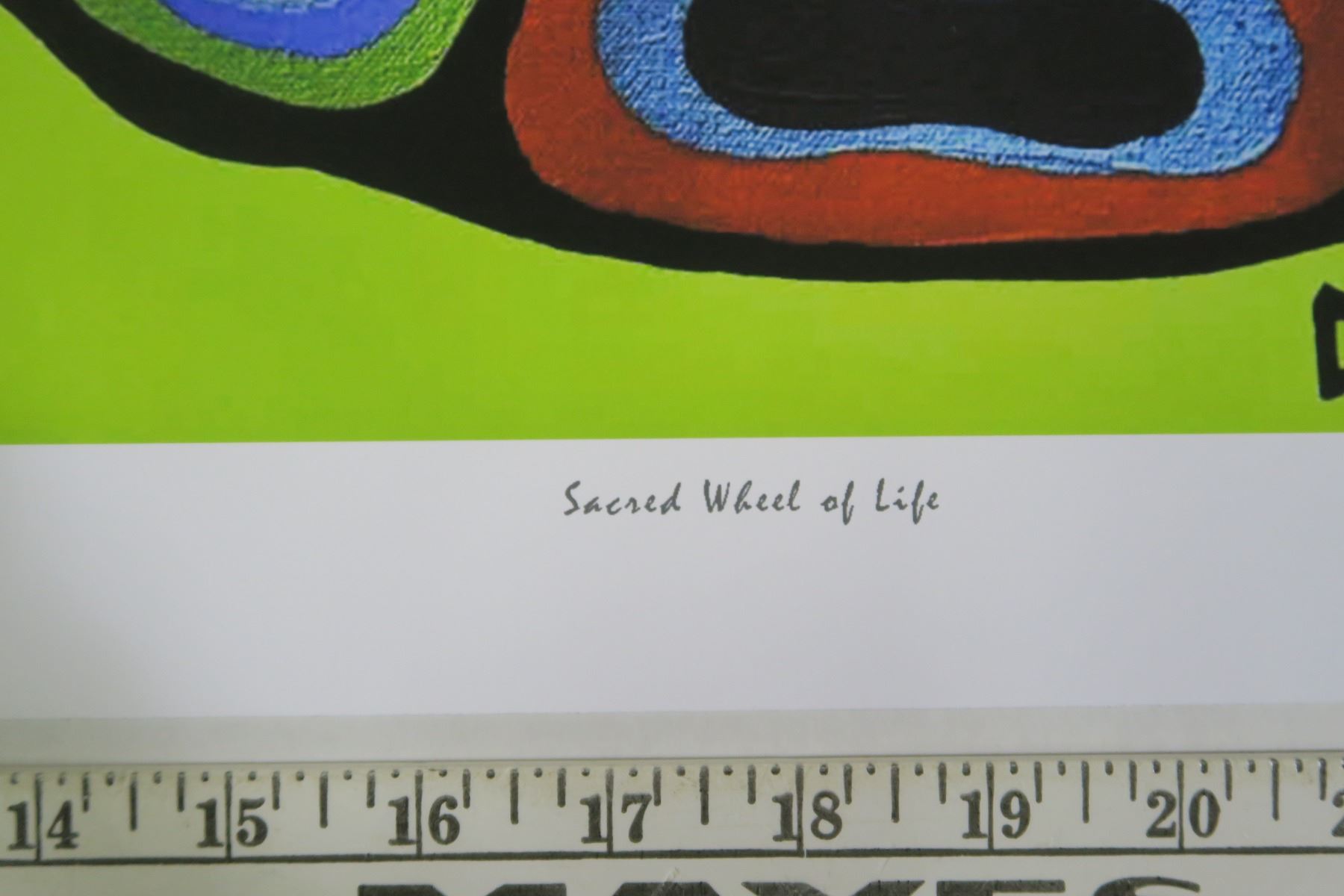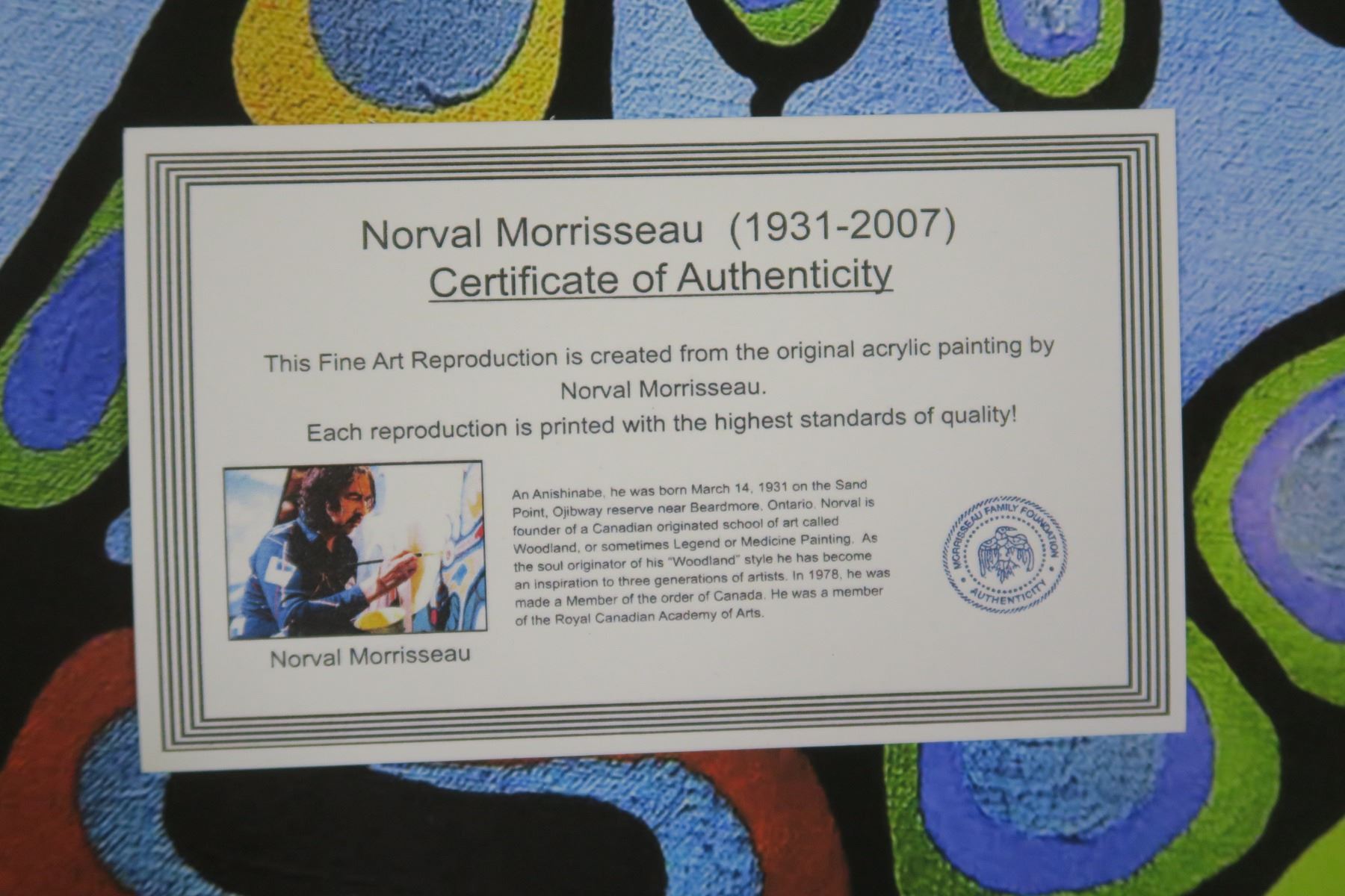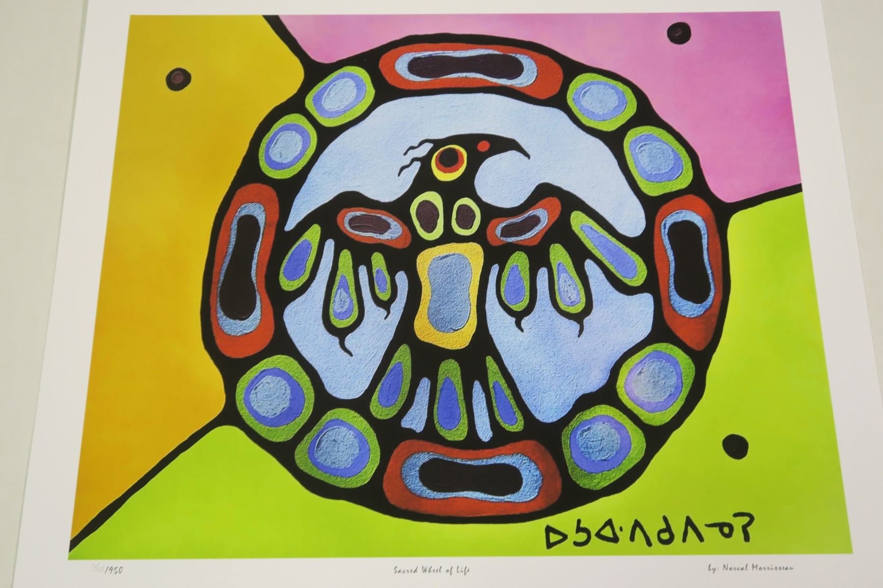 This fine art reproduction is created from the original acrylic painting; "Sacred Wheel of Life" by Norval Morrisseau. Morrisseau was a self-taught artist of Ojibwa ancestry (his Ojibwa name, which appears in syllabics on his paintings, means "Copper Thunderbird") who originated the pictographic style.