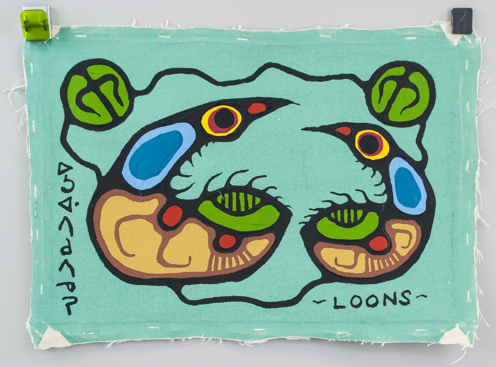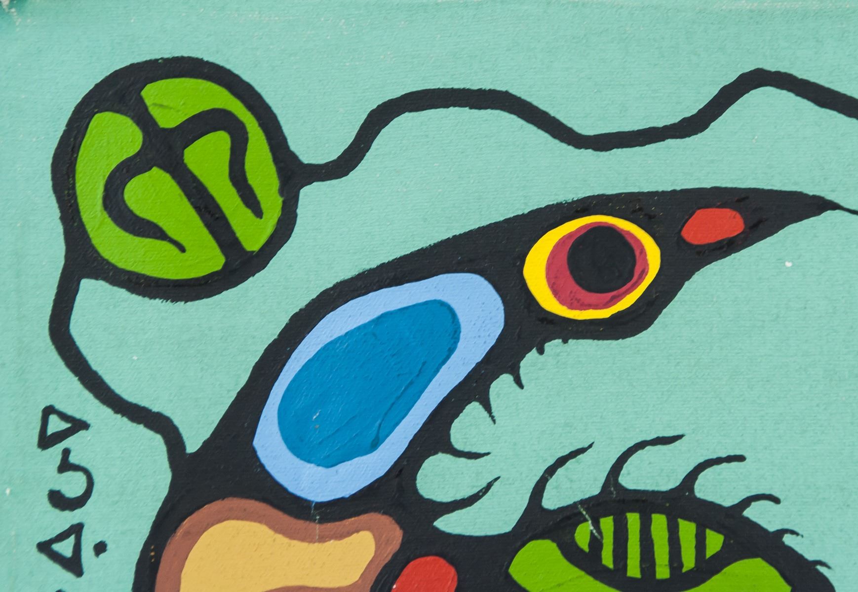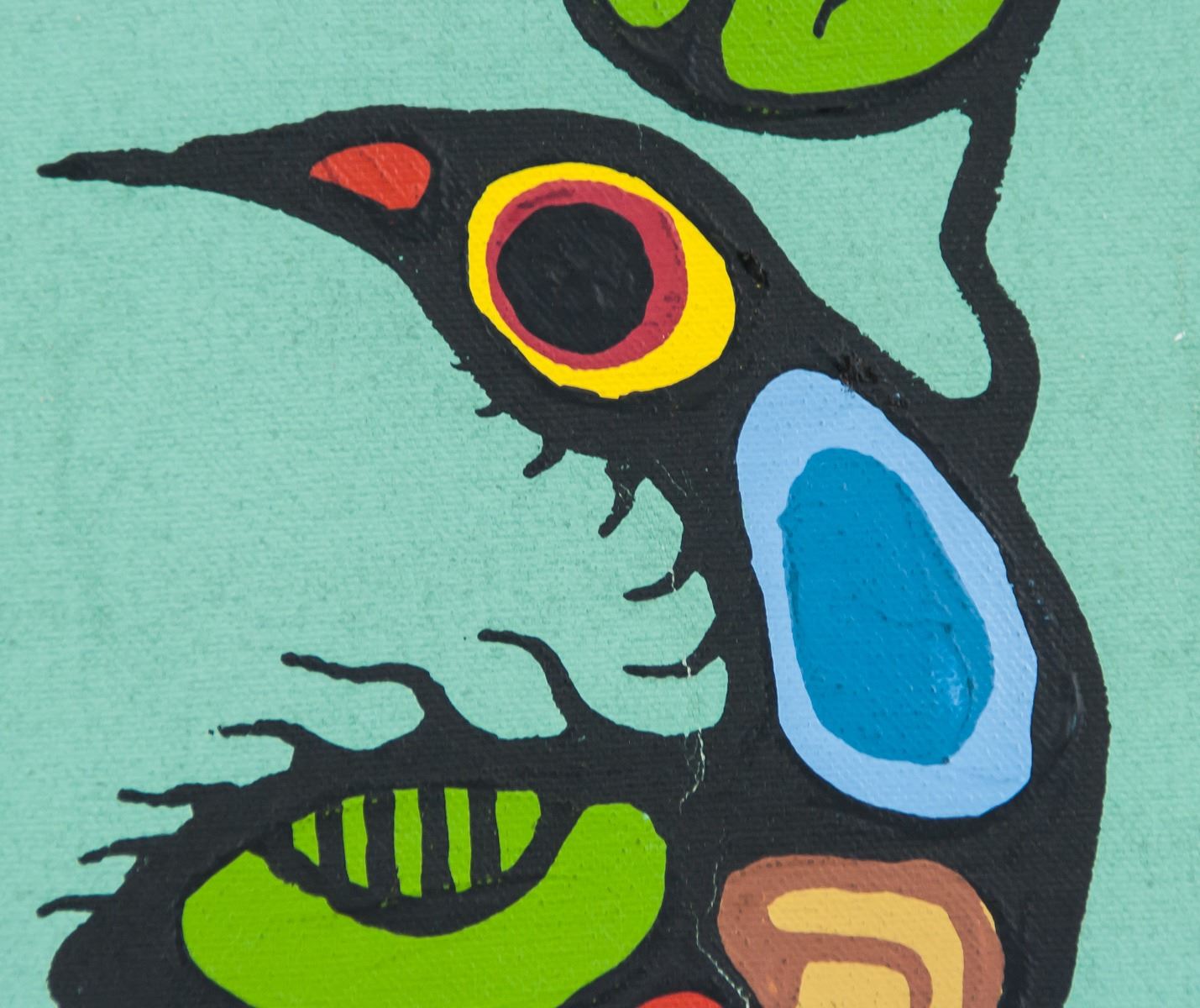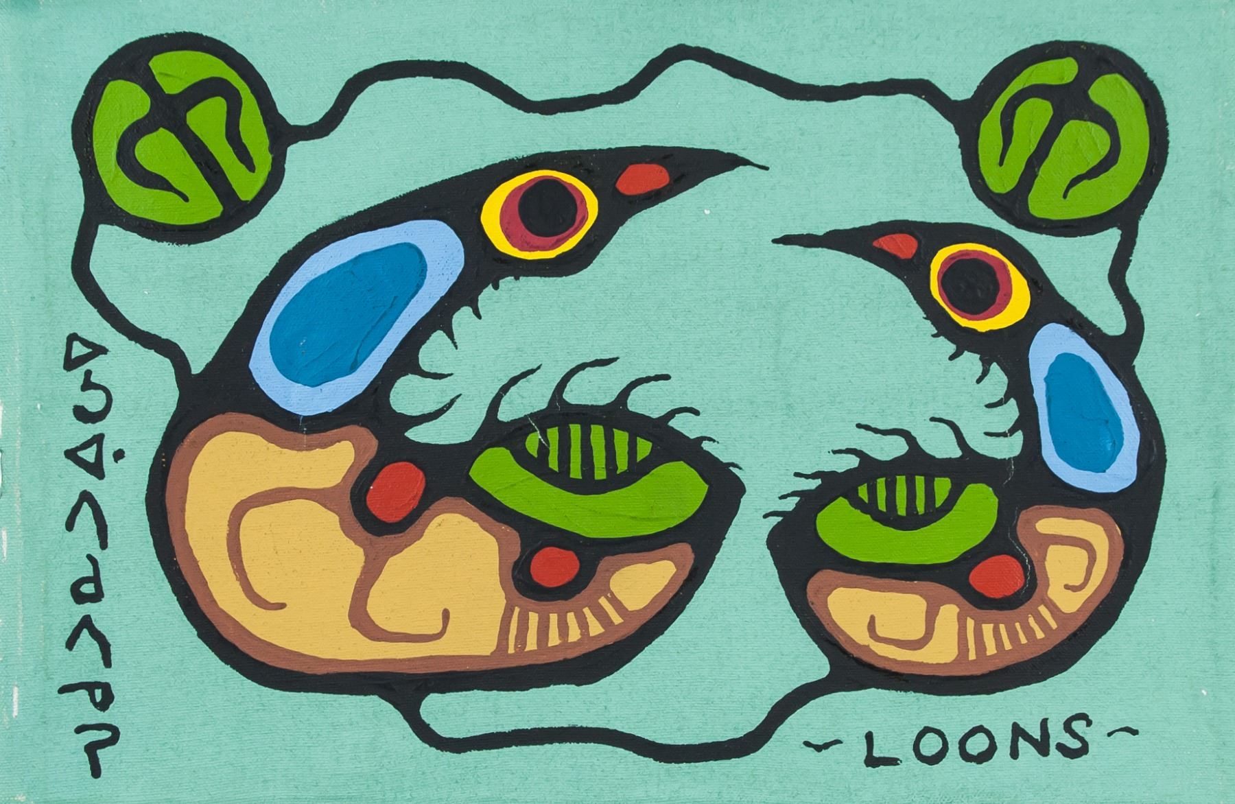 Acrylic on canvas, unframed. Featuring a pair of loons. Signed Norval Morrisseau (1932-2007, Canadian) in Cree syllabics alongside left edge. Signed Norval Morrisseau on verso and dated '79. Entitled, "Loons." Verso with authenticity statement and signed David Morrisseau, son of Norval Morrisseau. 30 x 43 cm (11.8 x 16.9 inches). Norval Morrisseau was an Anishinaabe Aboriginal Canadian artist. Best known for his paintings of mythical tableaux, his narrative works of figures and animals were painted in vibrant, fluorescent colors featuring thick black outlines akin to stained glass windows or woodcuts. “These paintings only remind you that you're an Indian. Inside somewhere, we're all Indians,” the self-taught artist once said. “So now when I befriend you, I'm trying to get the best Indian, bring out that Indianness in you to make you think that everything is sacred.” Born on March 14, 1932, in Beardmore, Ontario, he achieved widespread national success throughout his artistic career, garnering major commissions such as a large mural created for Expo 67 in 1967, which expressed the political dissatisfaction of the First Nations People of Canada. Morrisseau also regularly exhibited and sold his work in various Canadian galleries until his death in Toronto on December 4, 2007. Today, his work can be found in the collections of the Royal Ontario Museum, the National Gallery of Canada, the Dennos Museum Center, and the Art Gallery of Windsor, among many others.