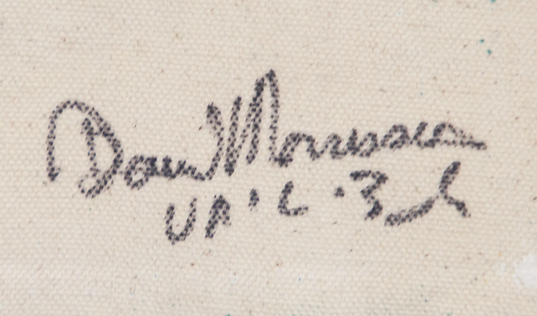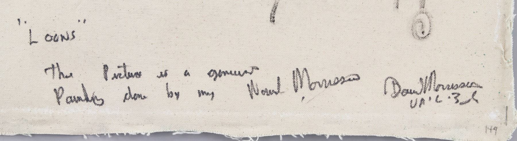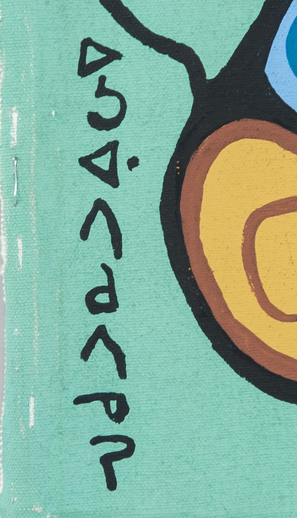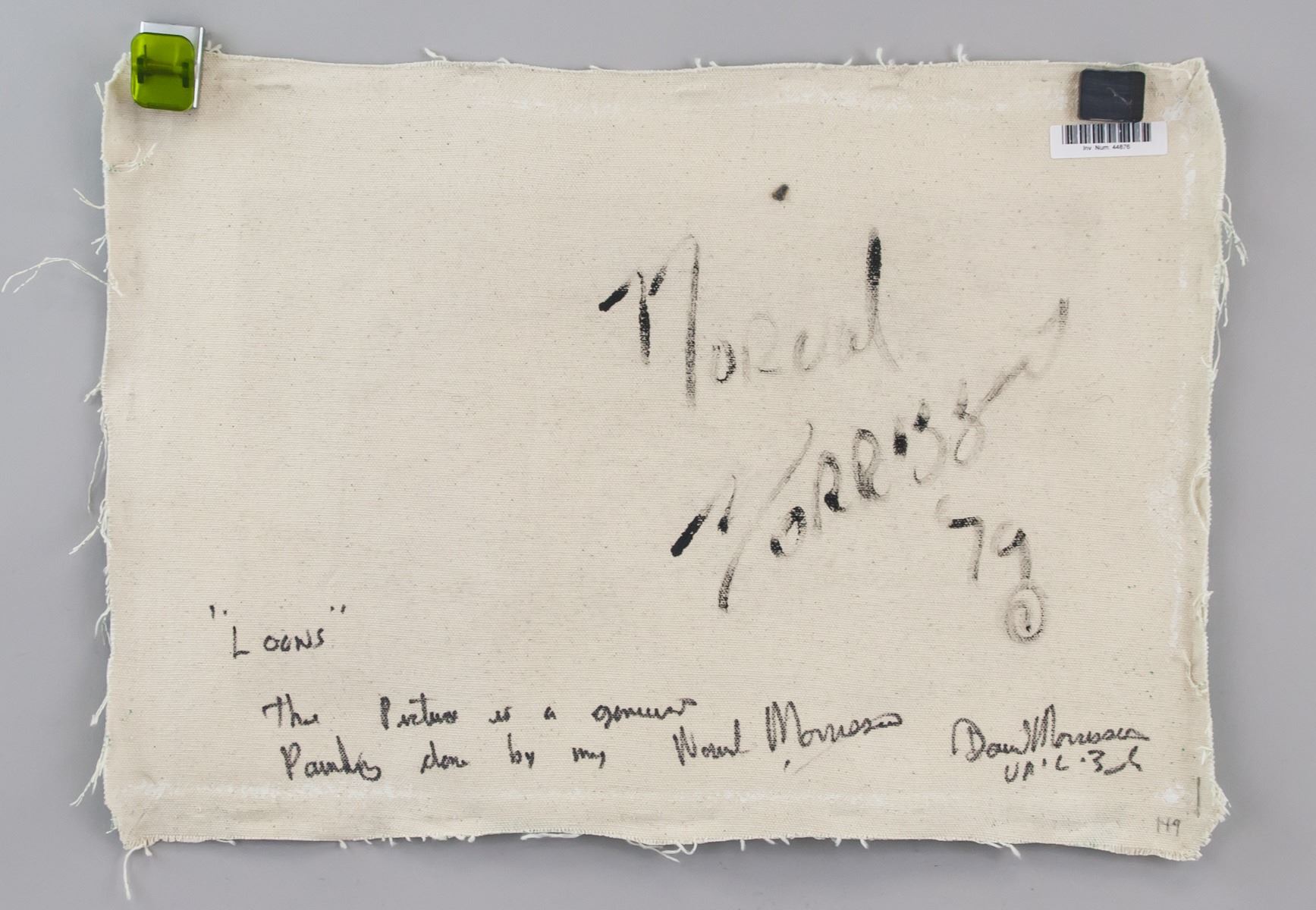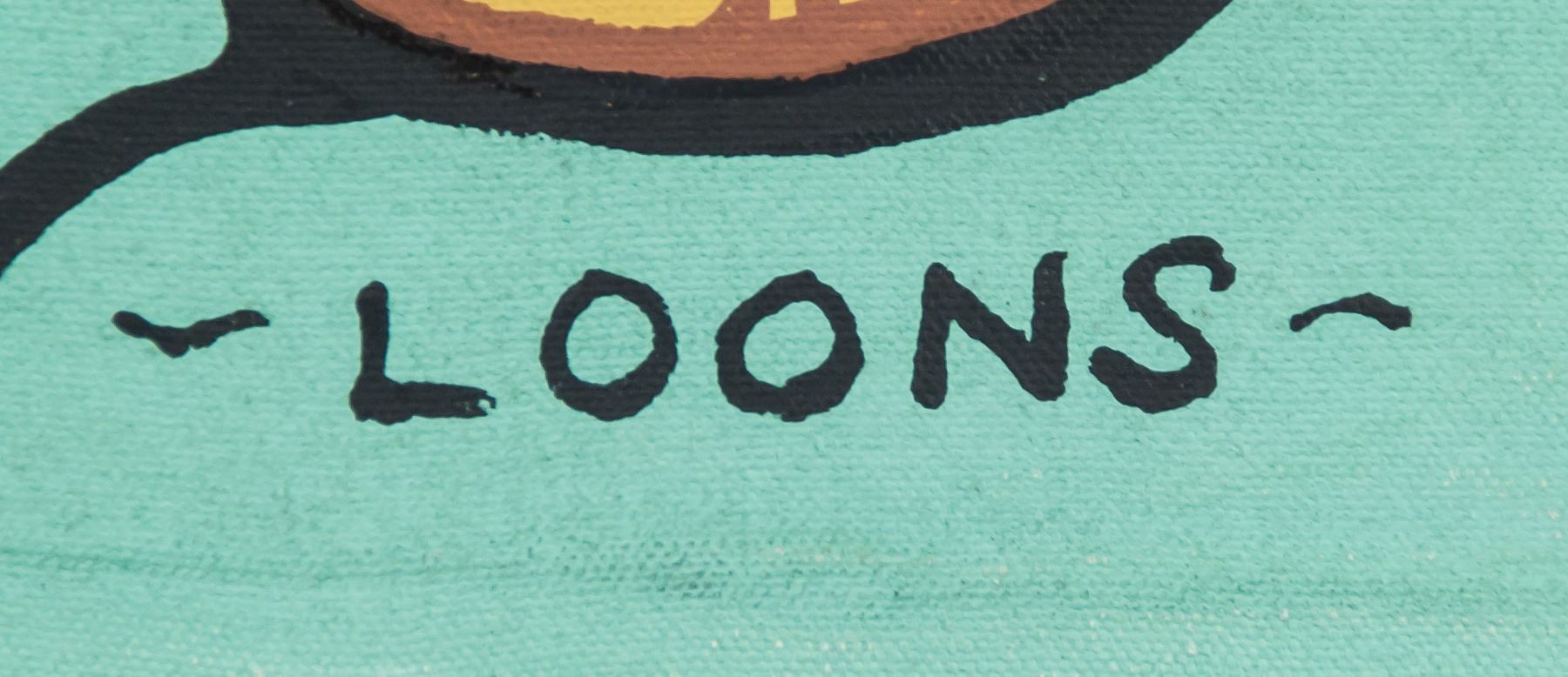 Acrylic on canvas, unframed. Featuring a pair of loons. Signed Norval Morrisseau (1932-2007, Canadian) in Cree syllabics alongside left edge. Signed Norval Morrisseau on verso and dated '79. Entitled, "Loons." Verso with authenticity statement and signed David Morrisseau, son of Norval Morrisseau. 30 x 43 cm (11.8 x 16.9 inches). Norval Morrisseau was an Anishinaabe Aboriginal Canadian artist. Best known for his paintings of mythical tableaux, his narrative works of figures and animals were painted in vibrant, fluorescent colors featuring thick black outlines akin to stained glass windows or woodcuts. “These paintings only remind you that you're an Indian. Inside somewhere, we're all Indians,” the self-taught artist once said. “So now when I befriend you, I'm trying to get the best Indian, bring out that Indianness in you to make you think that everything is sacred.” Born on March 14, 1932, in Beardmore, Ontario, he achieved widespread national success throughout his artistic career, garnering major commissions such as a large mural created for Expo 67 in 1967, which expressed the political dissatisfaction of the First Nations People of Canada. Morrisseau also regularly exhibited and sold his work in various Canadian galleries until his death in Toronto on December 4, 2007. Today, his work can be found in the collections of the Royal Ontario Museum, the National Gallery of Canada, the Dennos Museum Center, and the Art Gallery of Windsor, among many others.