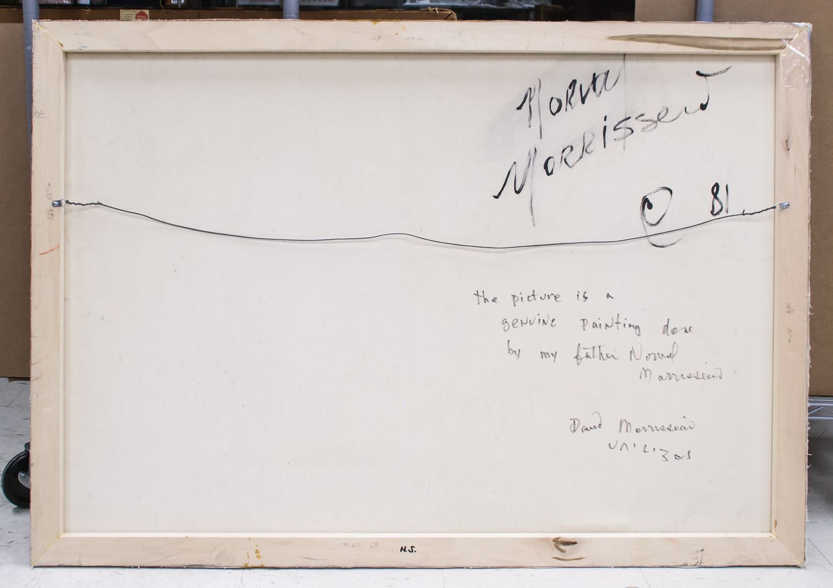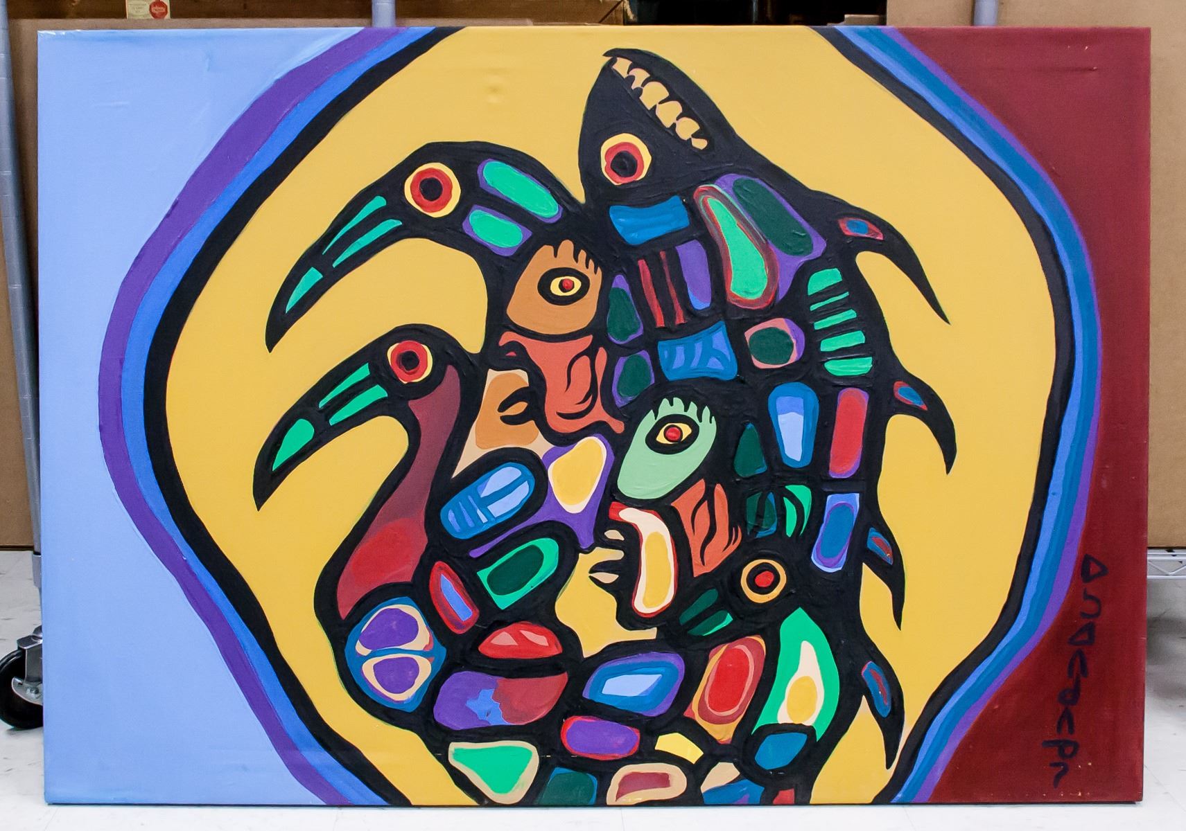 Acrylic on canvas, stretched. Featuring portrait of two fish shaman. Signed Norval Morrisseau (1932-2007, Canadian) in Cree syllabics alongside right edge. Signed Norval Morrisseau on verso and dated 81. Verso with authenticity statement and signed David Morrisseau, son of Norval Morrisseau: "the picture is a genuine painting done by my father Norval Morrisseau - David Morriseau [David's name in cree syllabics]. 112 x 82 cm (44.09 x 32.28 inches). Norval Morrisseau was an Anishinaabe Aboriginal Canadian artist. Best known for his paintings of mythical tableaux, his narrative works of figures and animals were painted in vibrant, fluorescent colors featuring thick black outlines akin to stained glass windows or woodcuts. “These paintings only remind you that you're an Indian. Inside somewhere, we're all Indians,” the self-taught artist once said. “So now when I befriend you, I'm trying to get the best Indian, bring out that Indianness in you to make you think that everything is sacred.” Born on March 14, 1932, in Beardmore, Ontario, he achieved widespread national success throughout his artistic career, garnering major commissions such as a large mural created for Expo 67 in 1967, which expressed the political dissatisfaction of the First Nations People of Canada. Morrisseau also regularly exhibited and sold his work in various Canadian galleries until his death in Toronto on December 4, 2007. Today, his work can be found in the collections of the Royal Ontario Museum, the National Gallery of Canada, the Dennos Museum Center, and the Art Gallery of Windsor, among many others. PROVENANCE: PROVENANCE: Gallery Sunami. Private Canadian collection