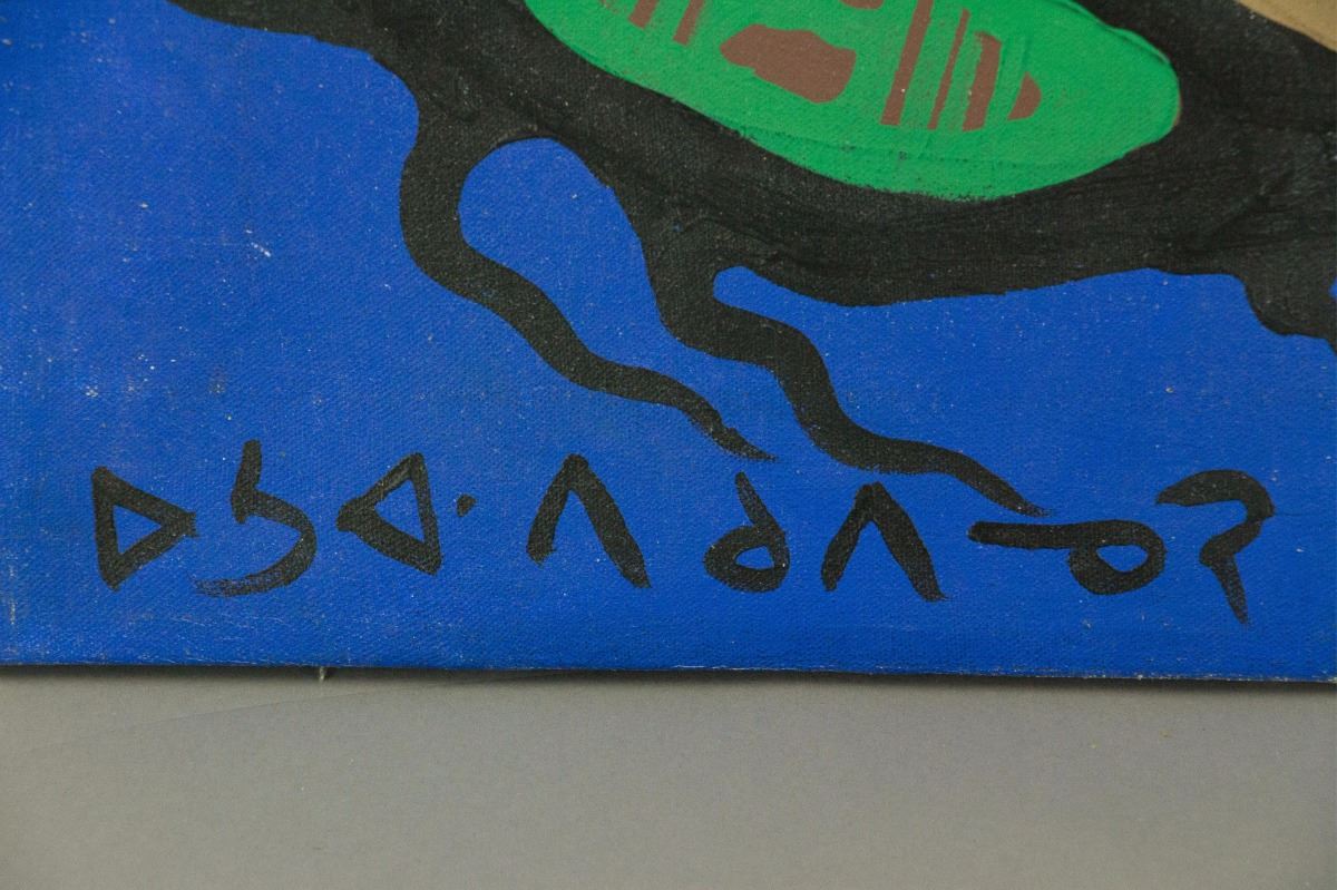 Thunderbirds and fish; acrylic on canvas; signed Norval Morrisseau on lower left; certified and signed by David Morrisseau (Son of Norval Morrisseau) on back; 68 cm x 54 cm , Norval Morrisseau was an Aboriginal Canadian artist, known as the "Picasso of the North".