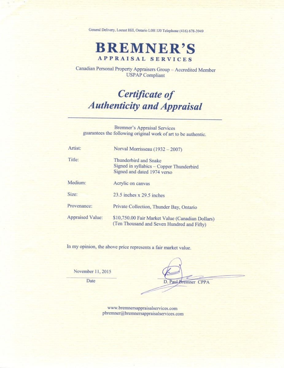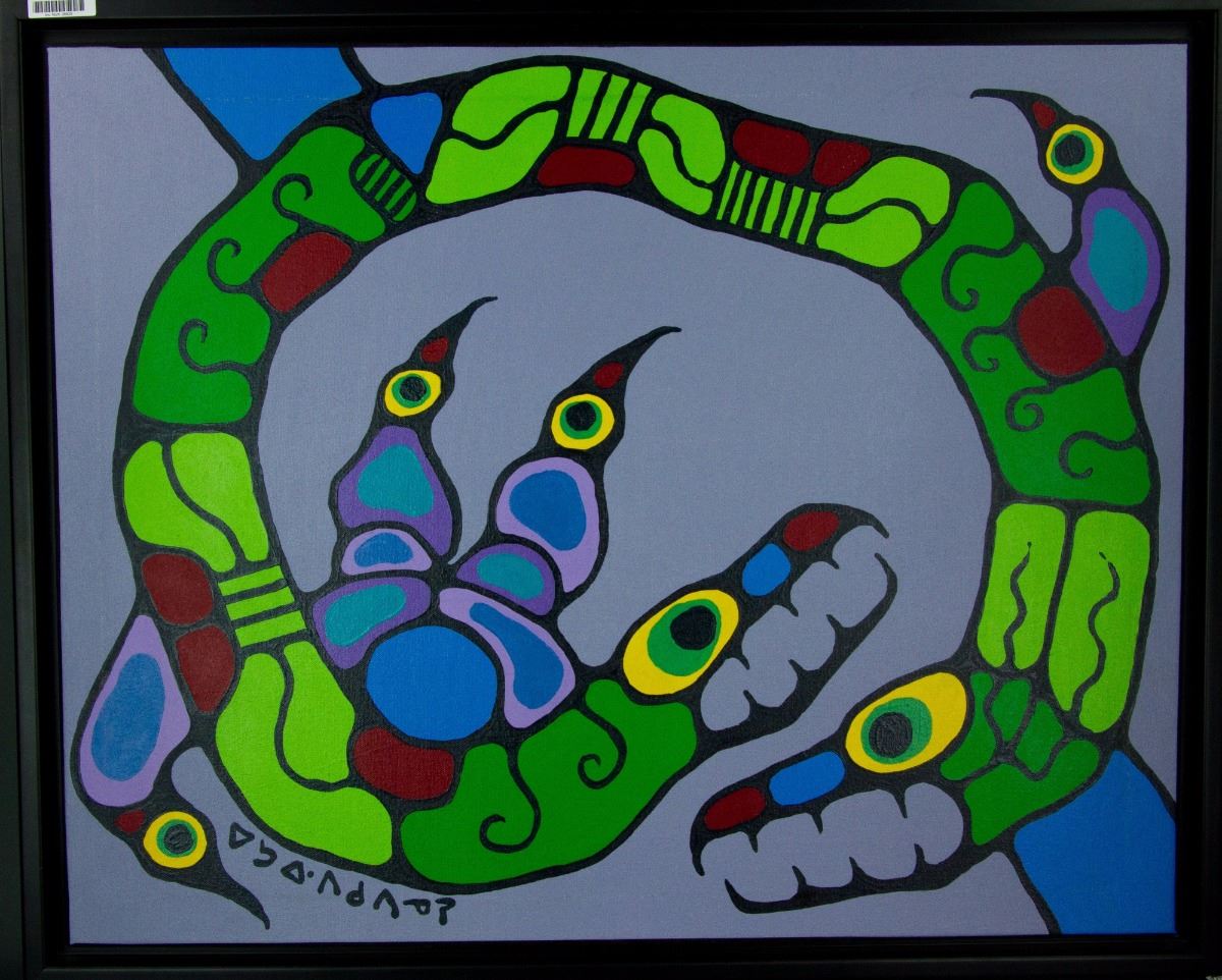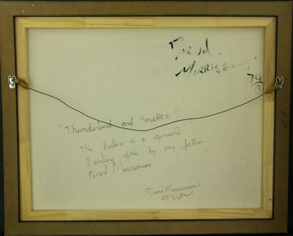 Thunderbird and snake; oil on canvas with frame; signed on the lower left; titled and dated 1974 on the back of the canvas; accompanied with Certificate of Authenticity and Appraisal from Bremner's Appraisal Services; 67 cm × 81 cm