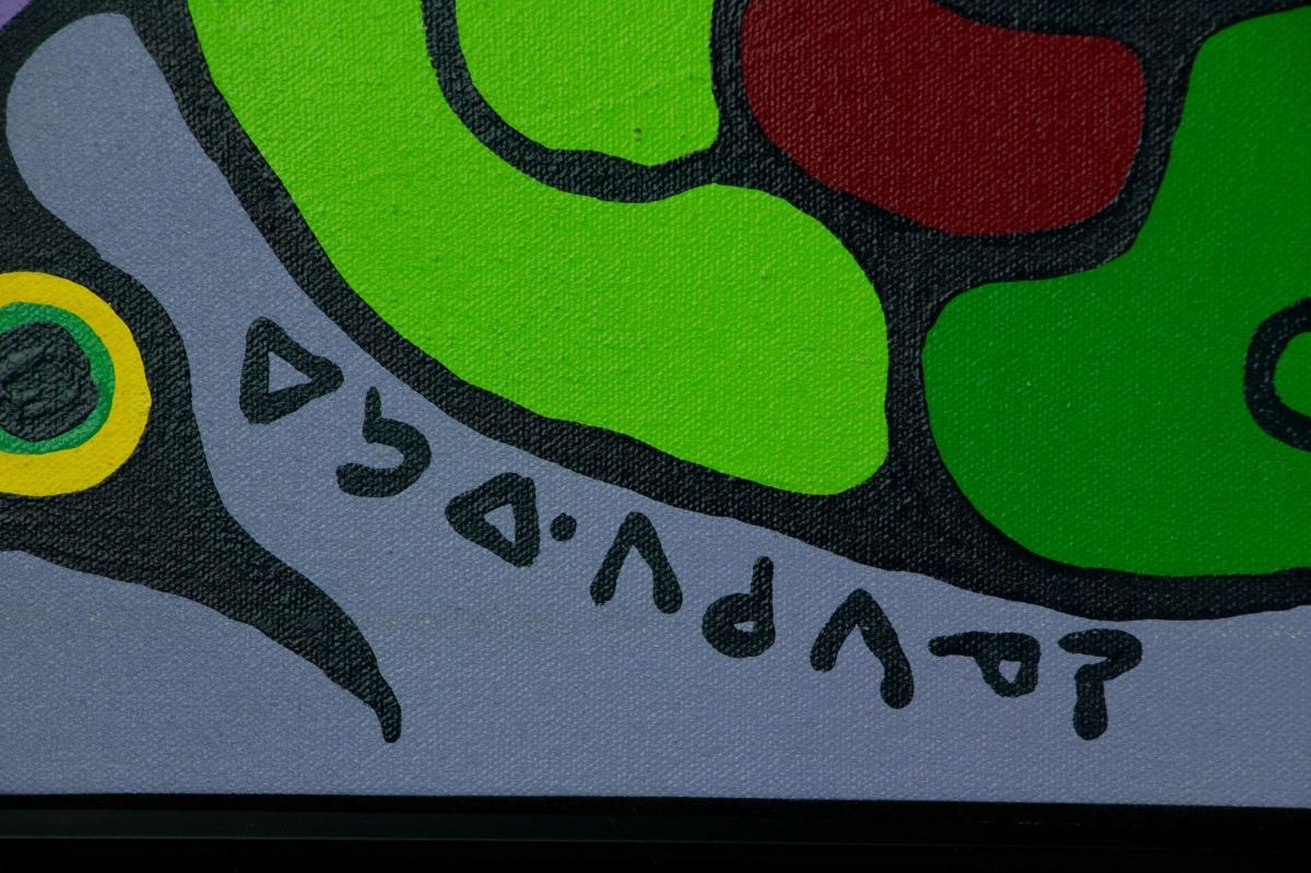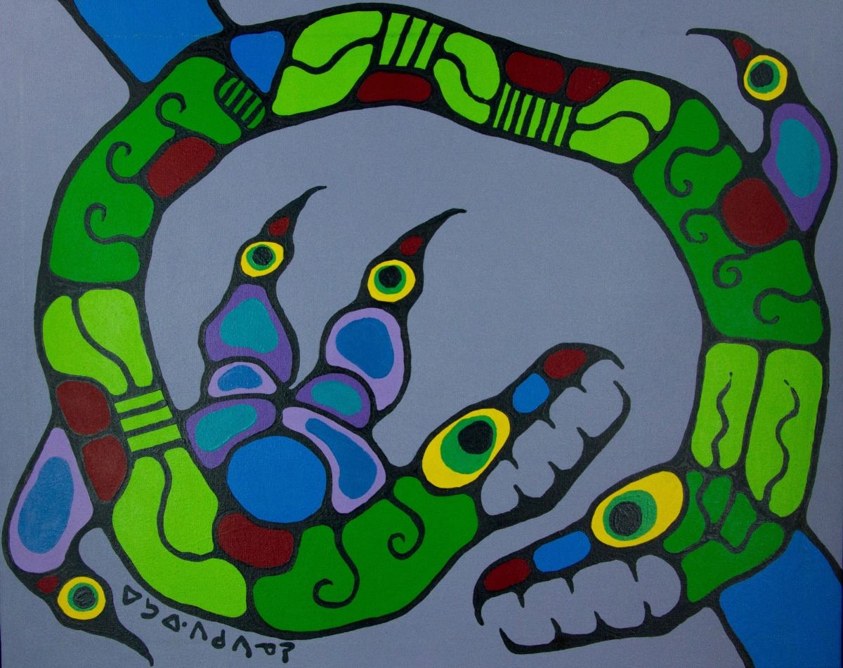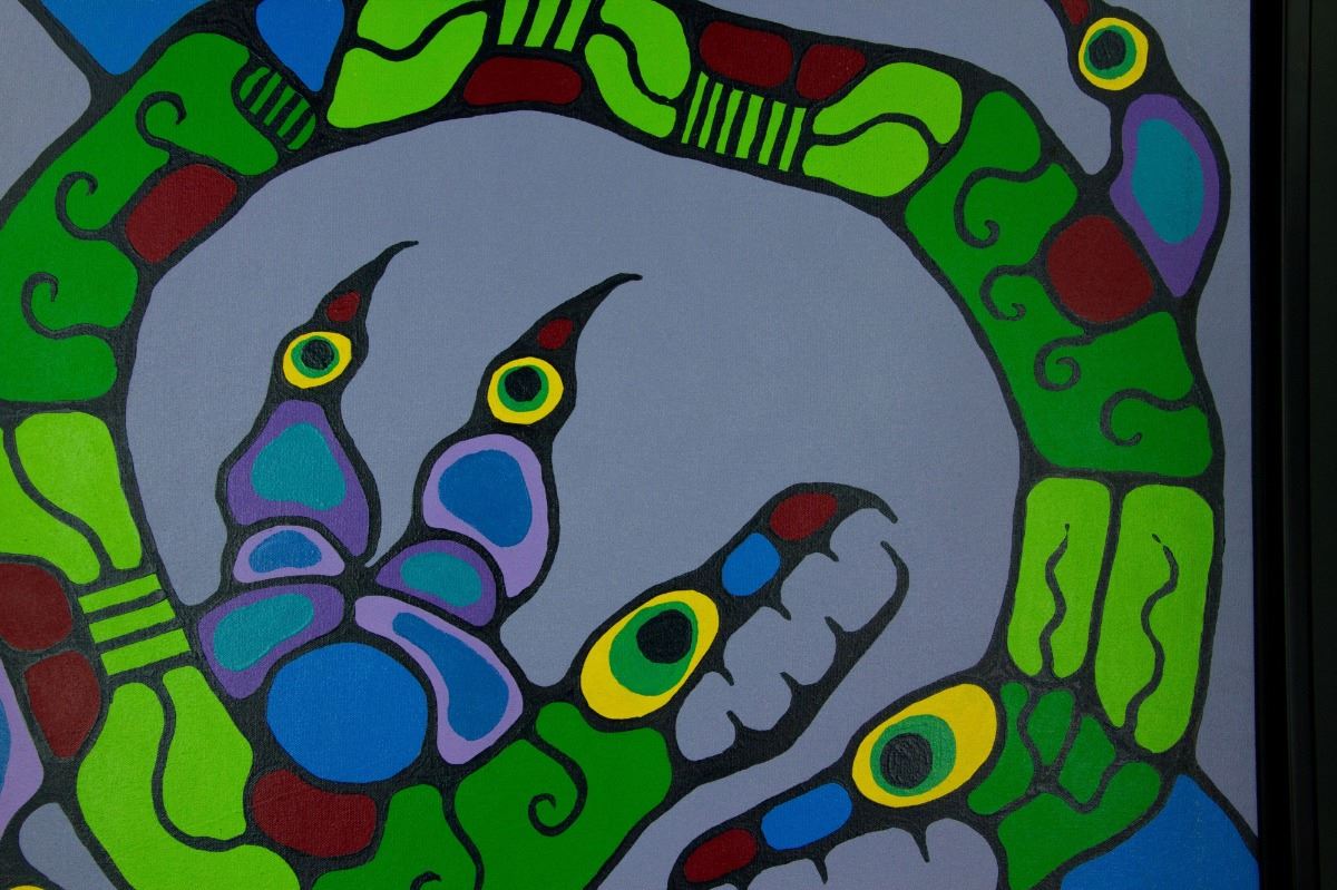 Thunderbird and snake; oil on canvas with frame; signed on the lower left; titled and dated 1974 on the back of the canvas; accompanied with Certificate of Authenticity and Appraisal from Bremner's Appraisal Services; 67 cm × 81 cm