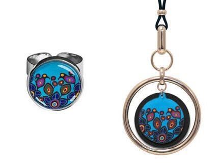 Norval Morrisseau - Vegan Leather Two Way Necklace & Dome Style Adjustable Ring, "Flowers and Birds"